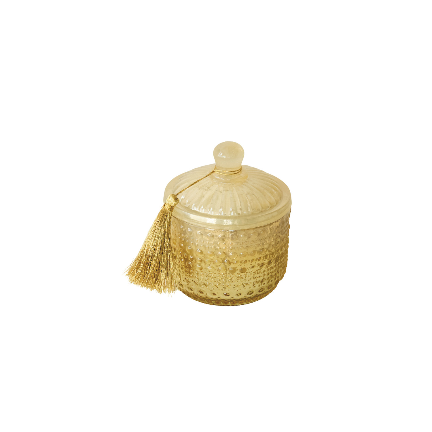 Catalog Name: 4-1/4" Round x 5"H 9.5 oz. Embossed Glass Holiday Hearth Scented Jar Candle w/ Lid & Gold Color Tassel, Cream Color & Gold Finish