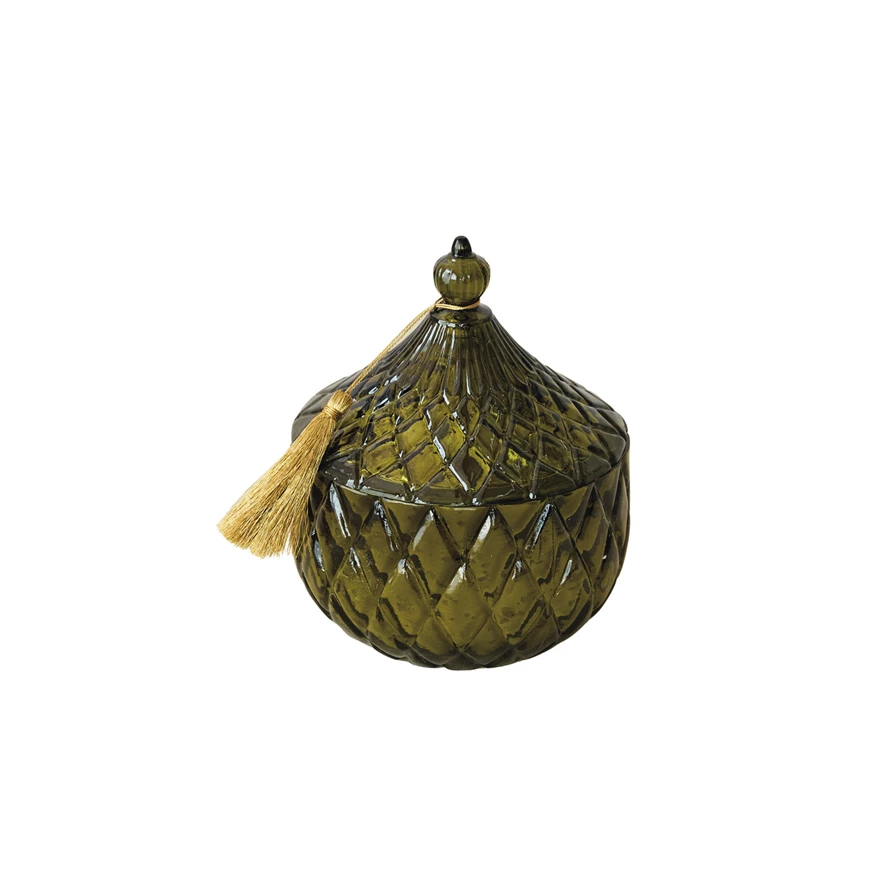 Catalog Name: 5-3/4" Round x 7-1/4"H 21.9 oz. Embossed Mercury Glass Walk In The Woods Scented Jar Candle w/ Lid & Gold Color Tassel, Green