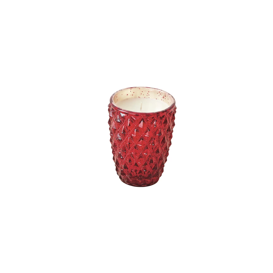 Catalog Name: 3-1/4" Round x 4-1/2"H 8.6 oz. Embossed Mercury Glass Laurel & Spice Scented Votive Candle, Red