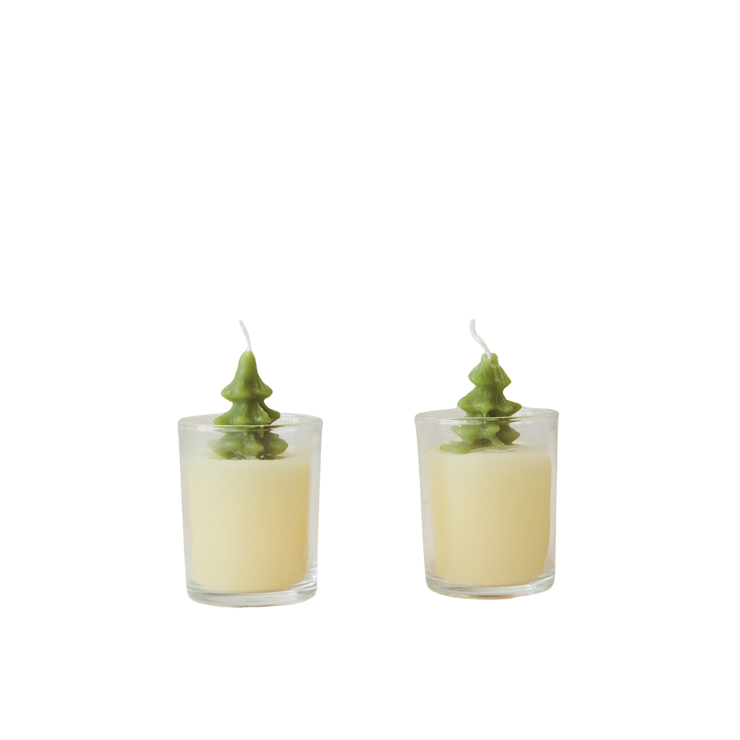 Catalog Name: 2" Round x 3-1/2"H Unscented Tree Candle in Glass Vessel, Green & Cream Color (Est. Burn Time 15 Hours)