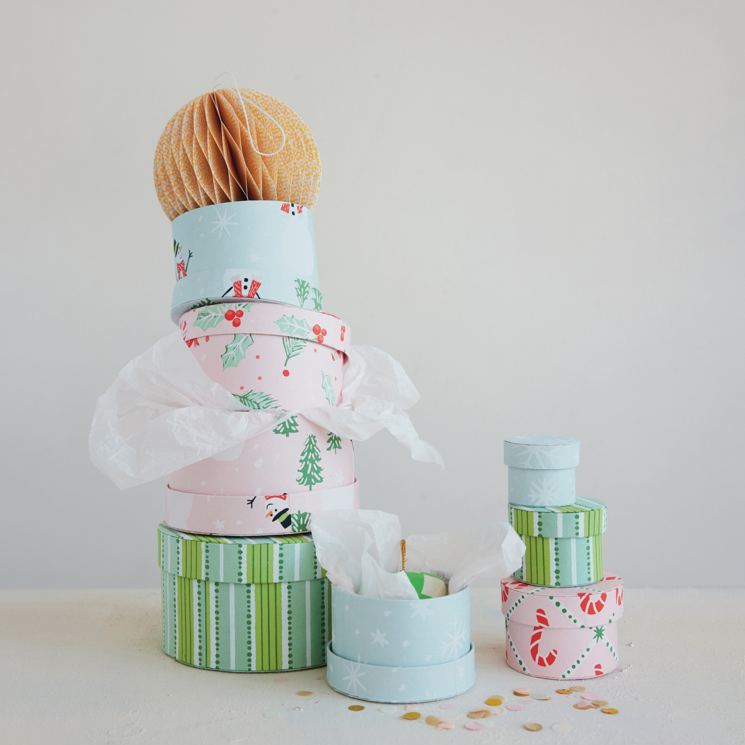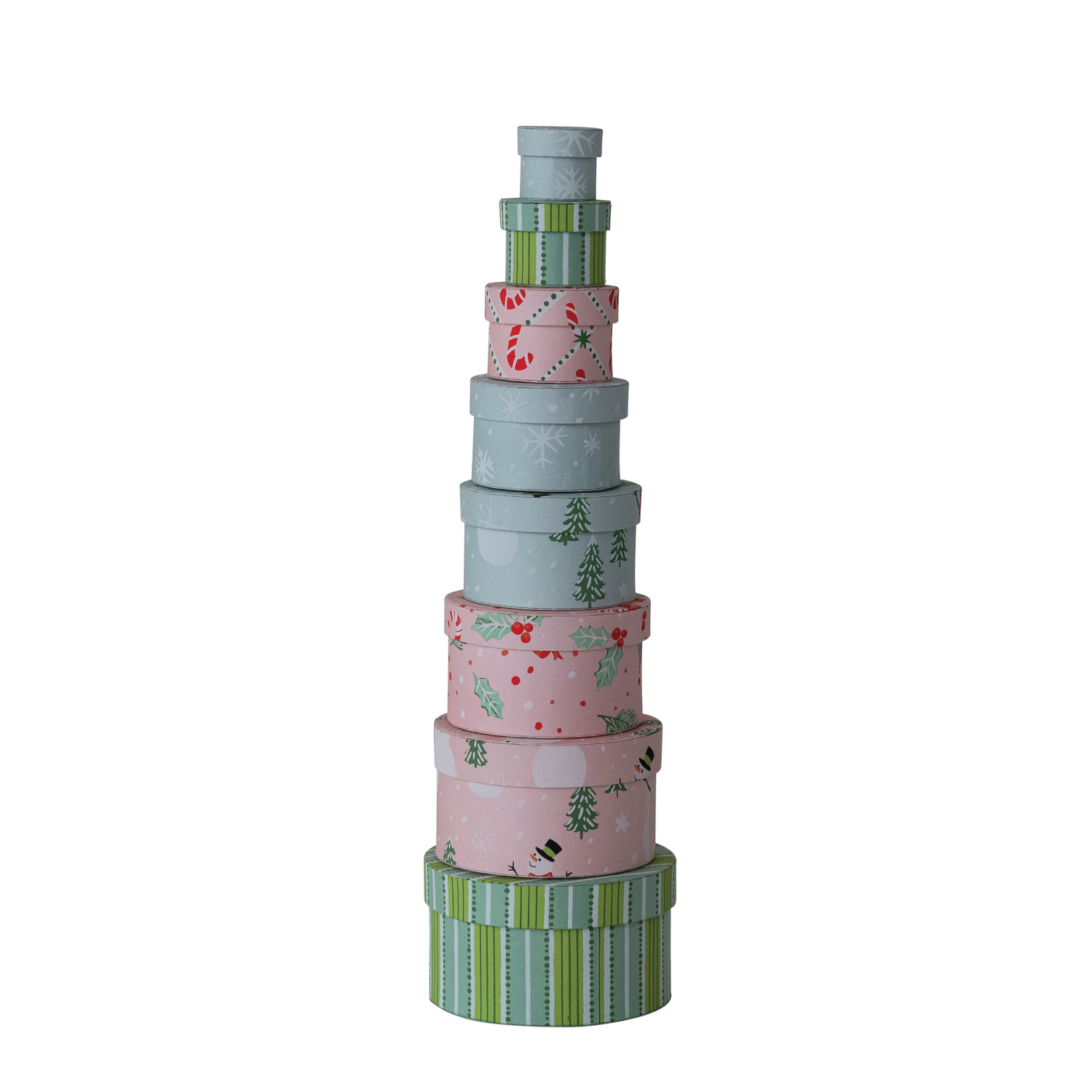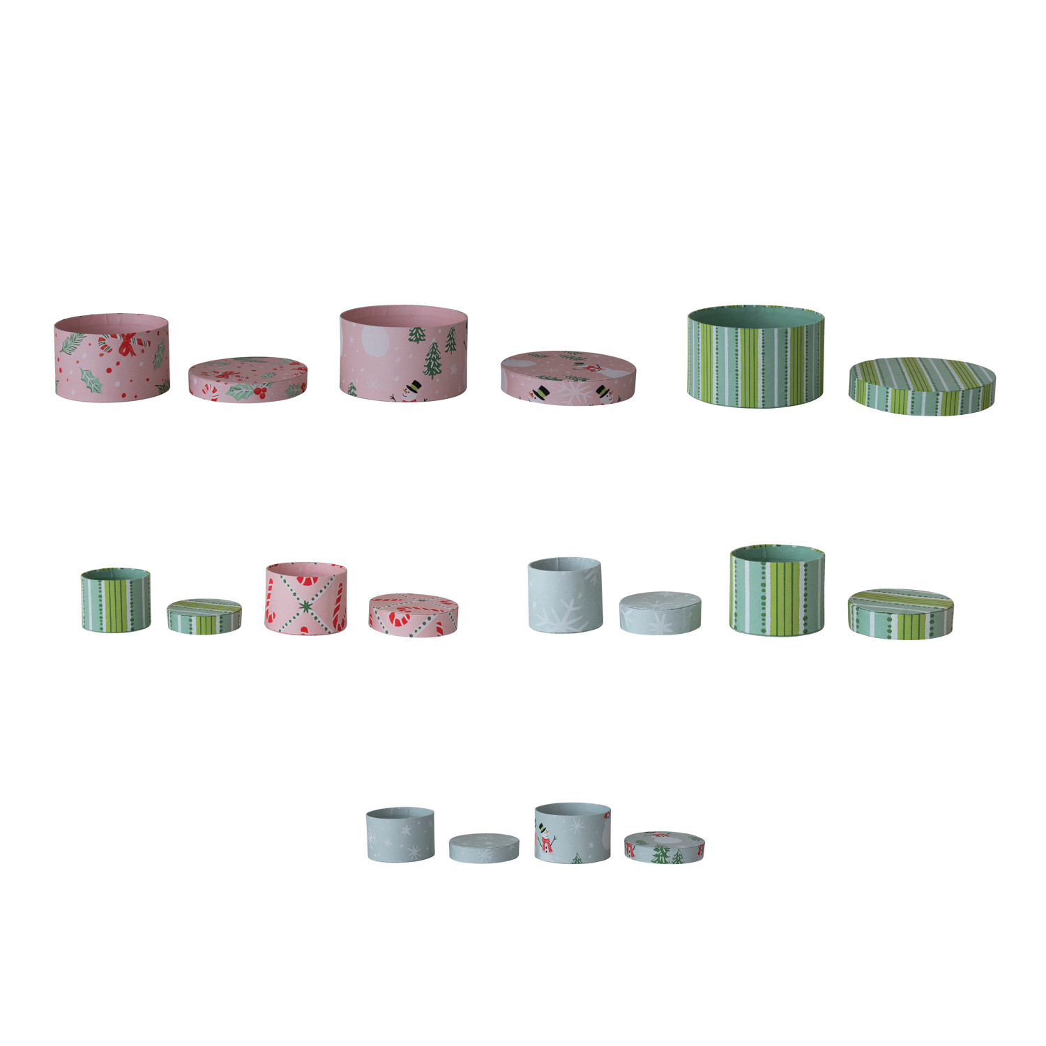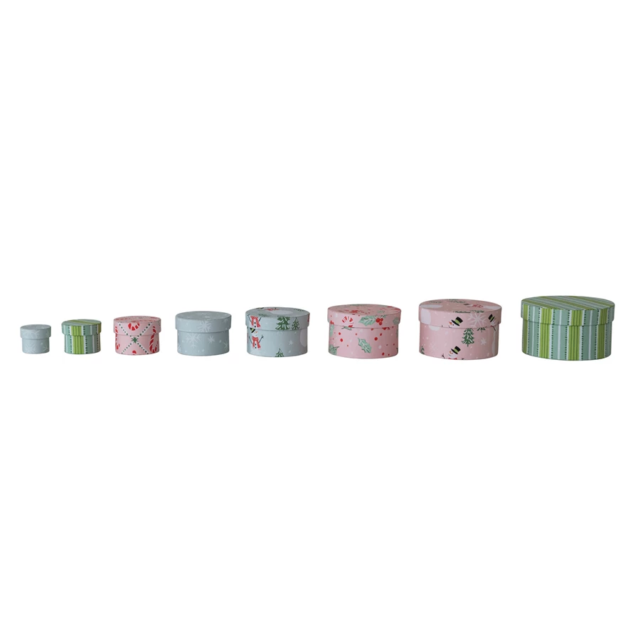 Catalog Name: 2-1/4" Round - 6-1/4" Round Handmade Printed Recycled Paper Nesting Gift Boxes w/ Holiday Patterns, Multi Color, Set of 8 ©