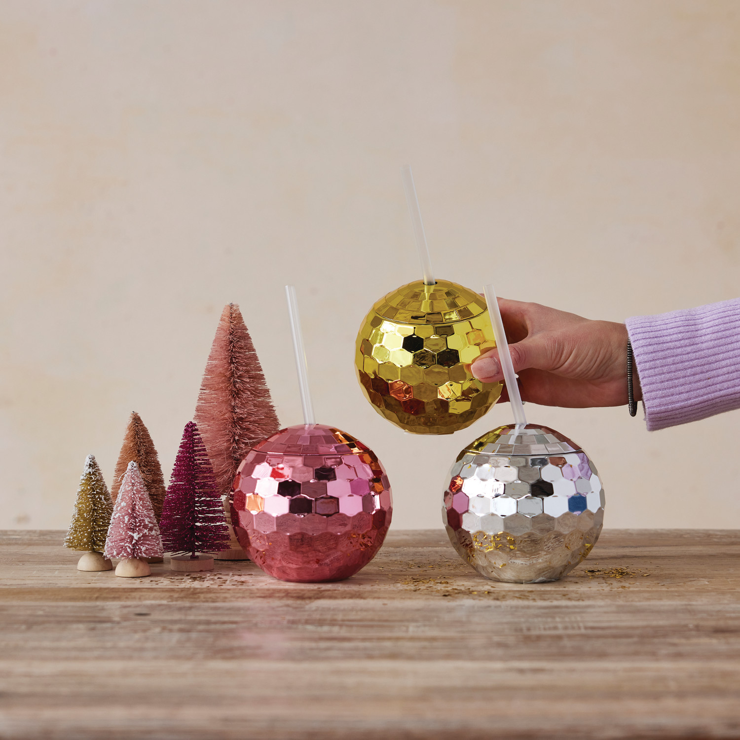 20 oz. Plastic Mirror Ball Cup with Lid & Straw, Pink, Set of 2