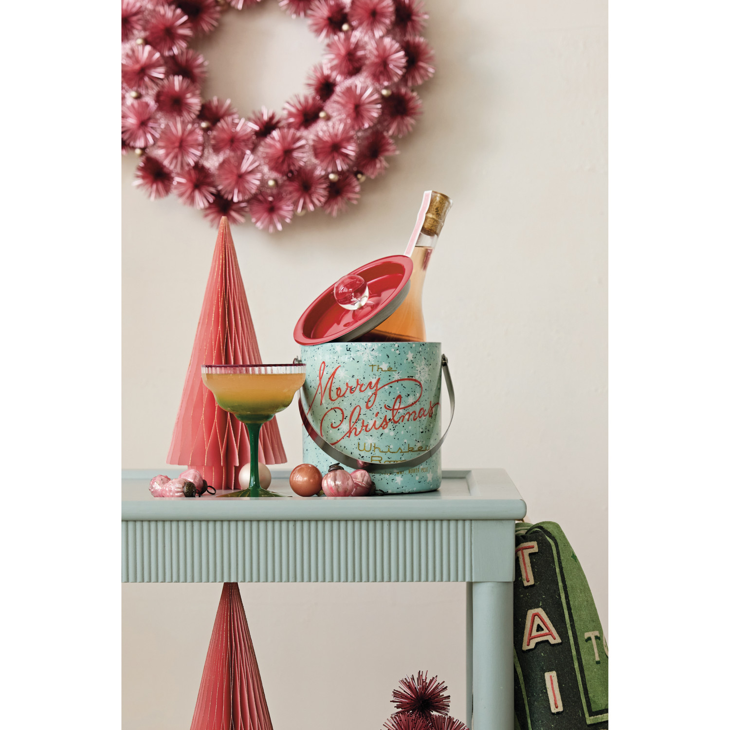 Catalog Name: 6" Round x 7-1/4"H 1-1/2 Quart Enameled Stainless Steel Ice Bucket w/ Snowflakes, Red Lid & Glass Knob "The Merry Christmas...", Multi Color & Nickel Finish ©