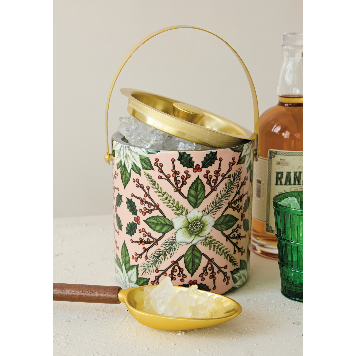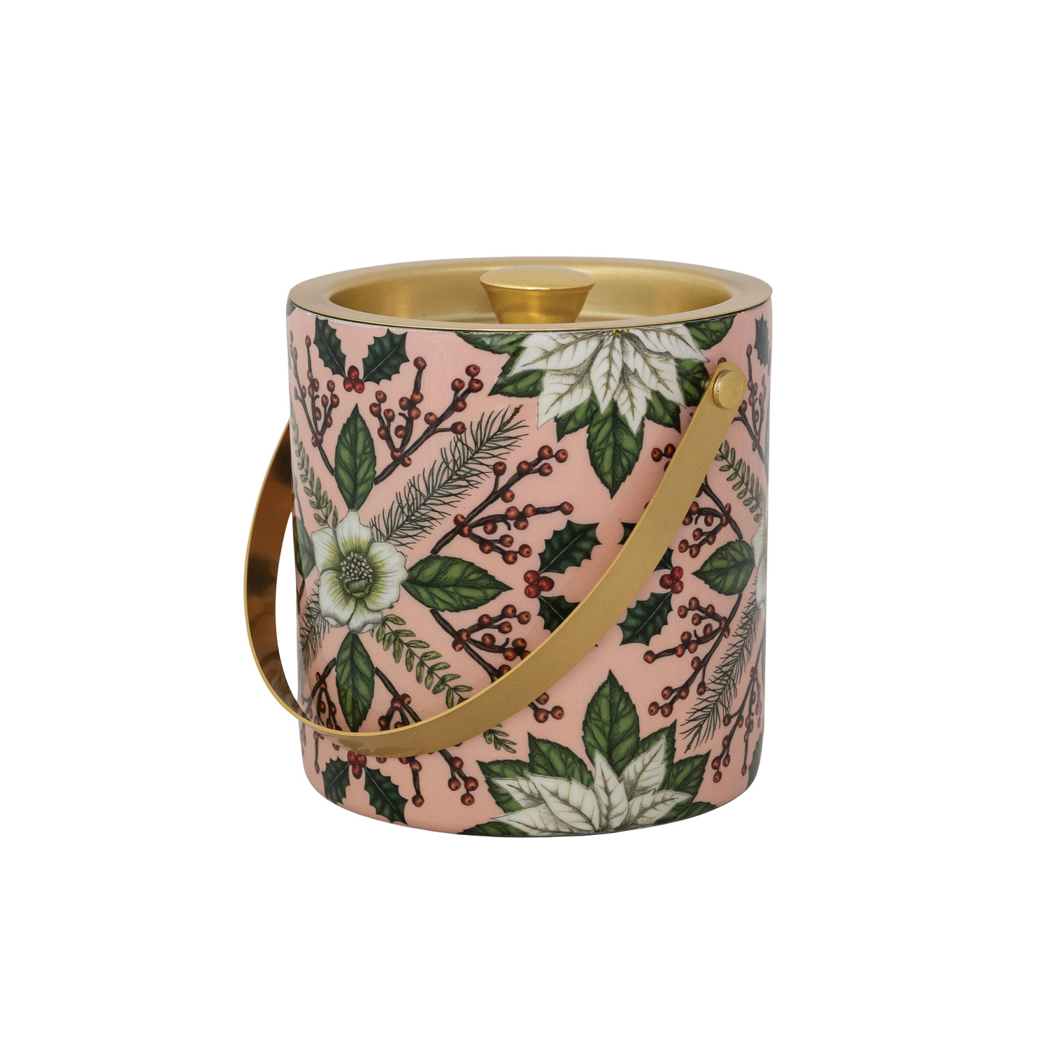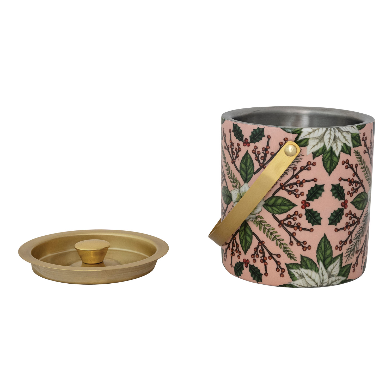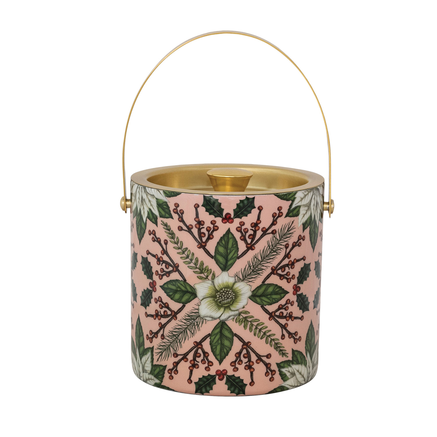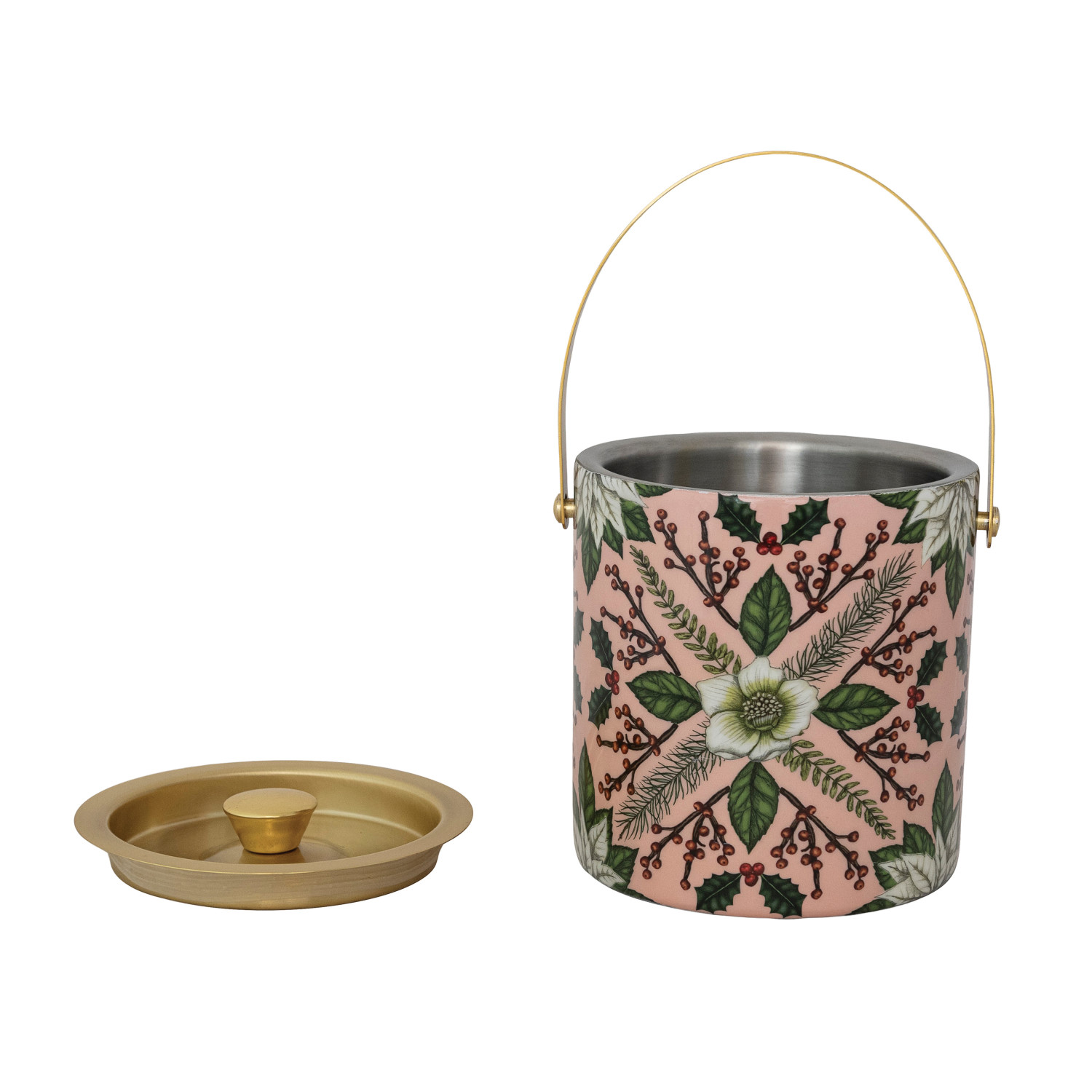 Catalog Name: 6" Round x 6-1/2"H 1-1/2 Quart Enameled Stainless Steel Ice Bucket w/ Seasonal Botanical Pattern, Multi Color & Gold Finish ©
