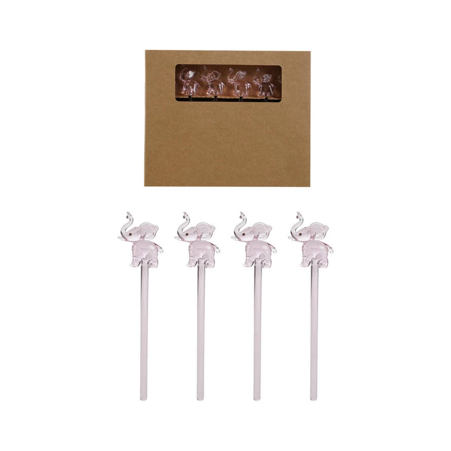 Glass Cocktail Stirrers with Pink Elephants, Boxed Set of 6