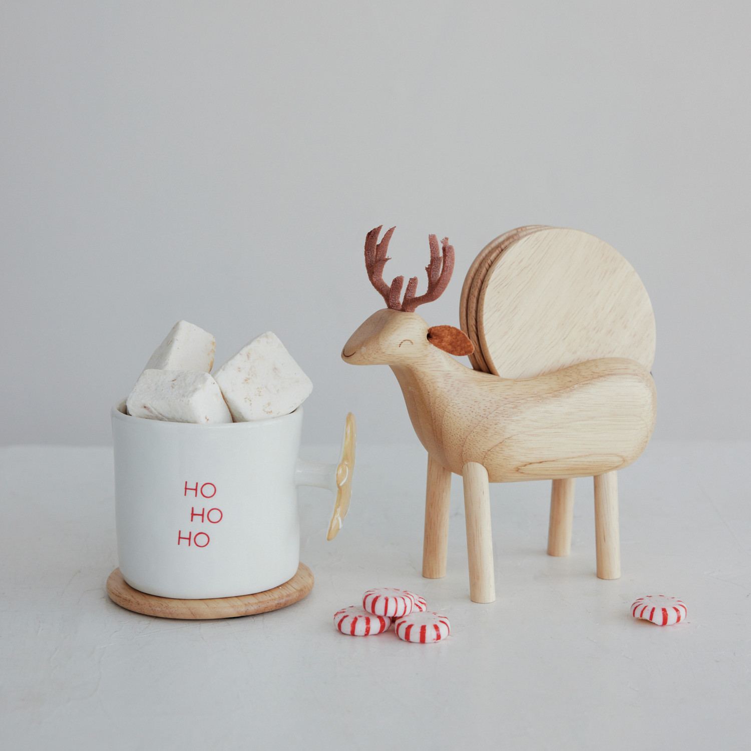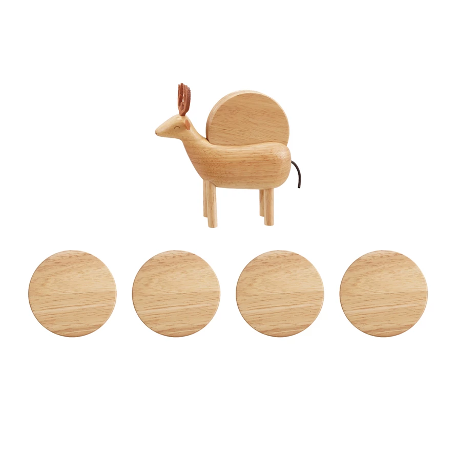 Rubberwood Coasters with Deer Shaped Holder & Faux Leather Antlers/Tail, Natural, Set of 5