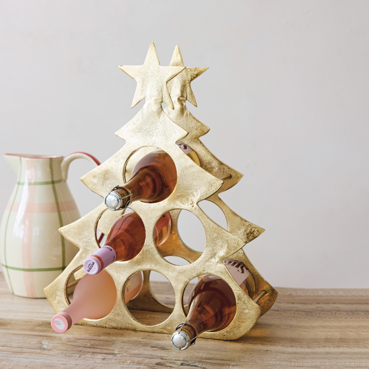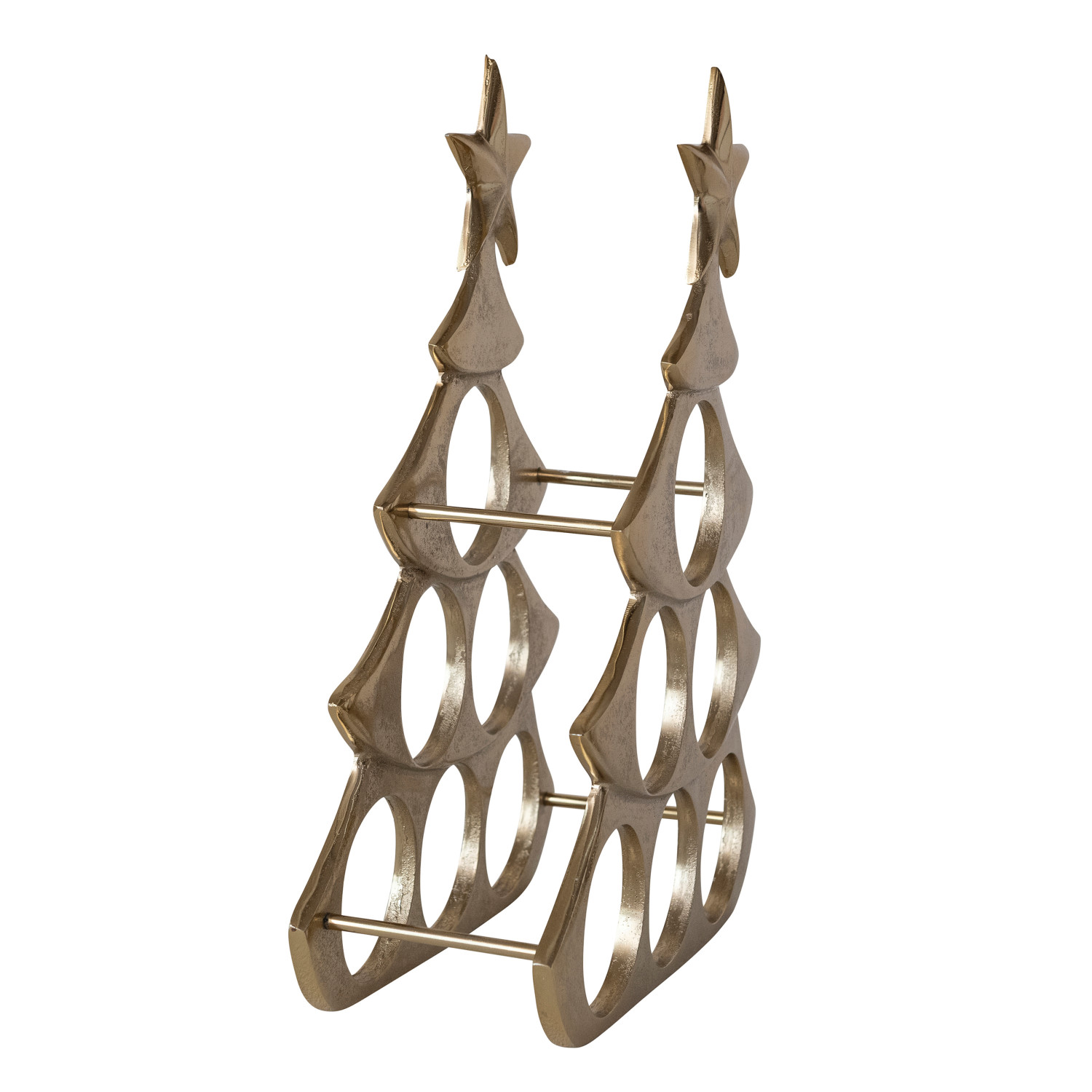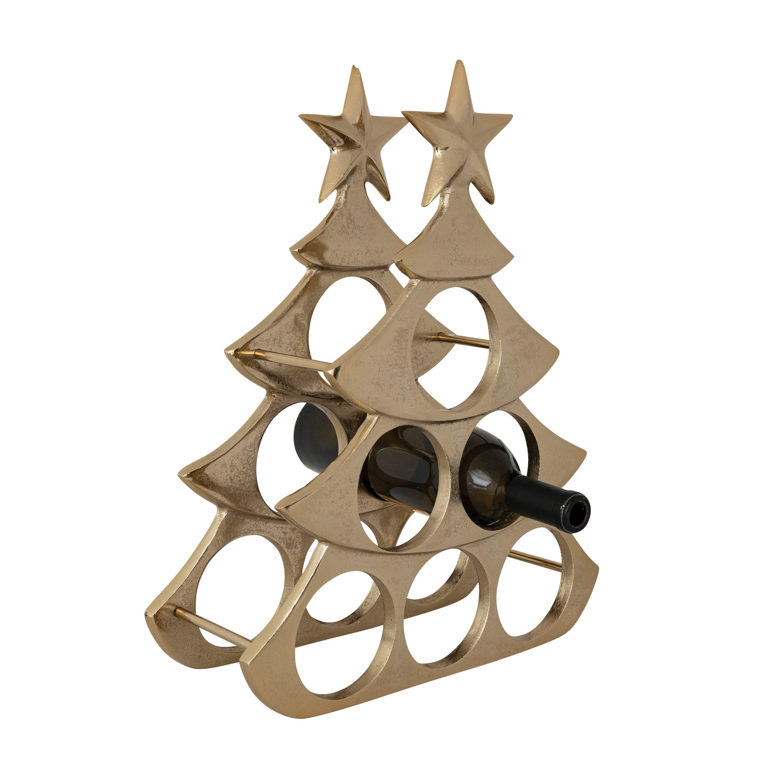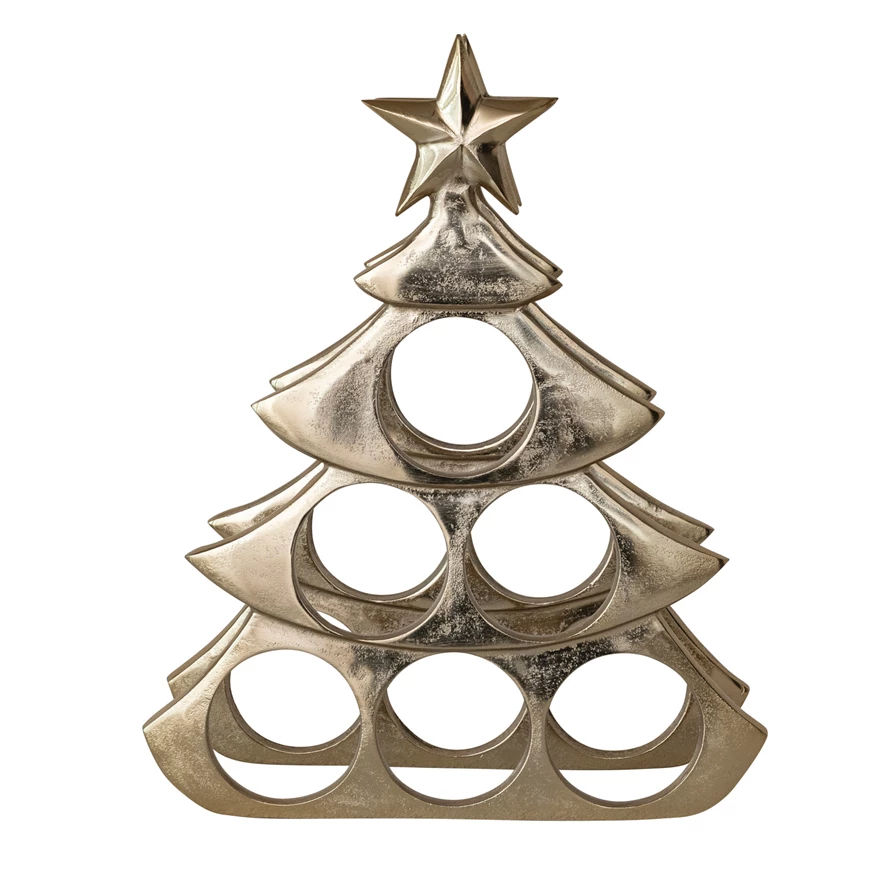 Cast Aluminum Tree Shaped Bottle Holder with Star, Gold Finish (Holds 6 Bottles)