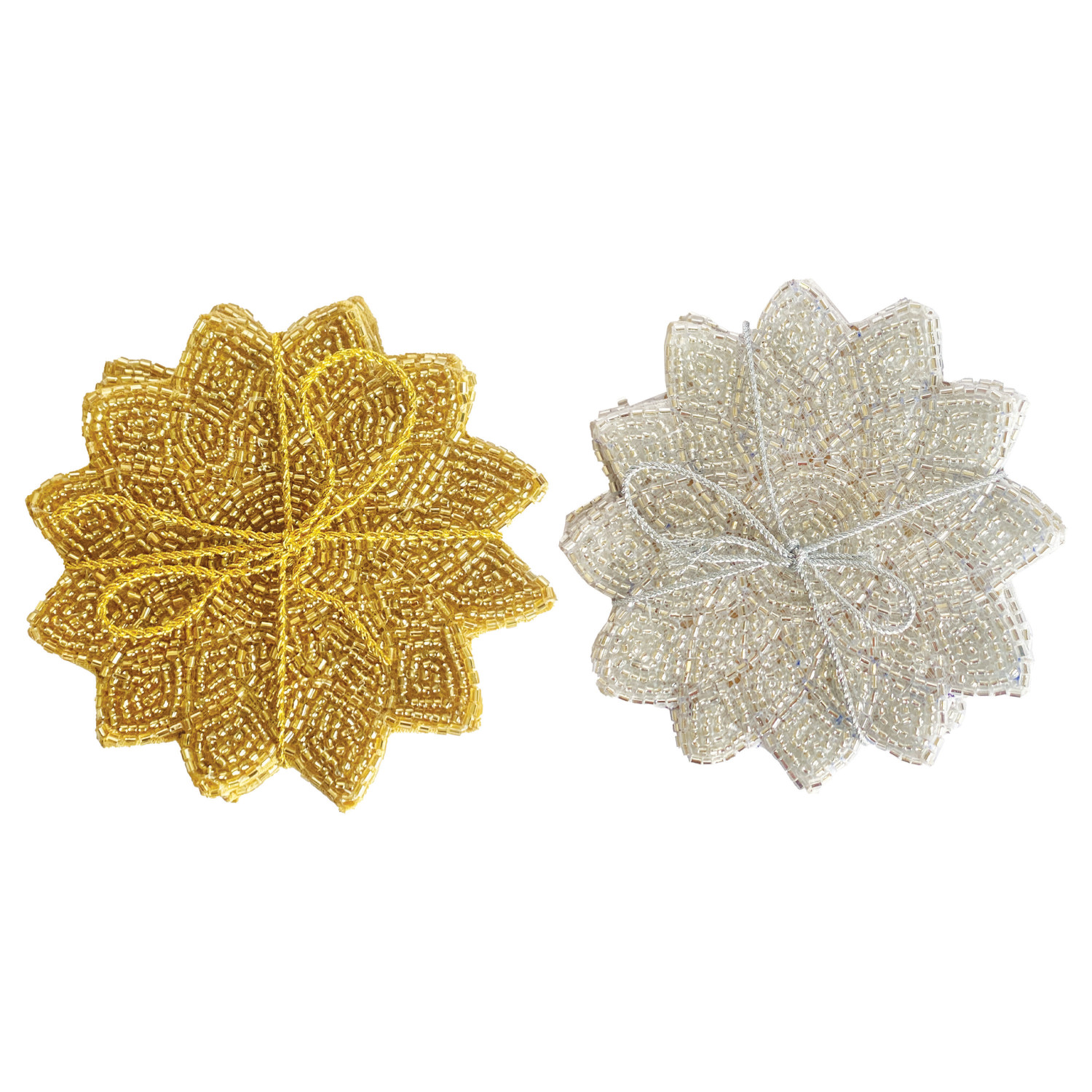 Handmade Beaded Cotton Coasters, Set of 4 Tied with Metallic Cord, 2 Colors