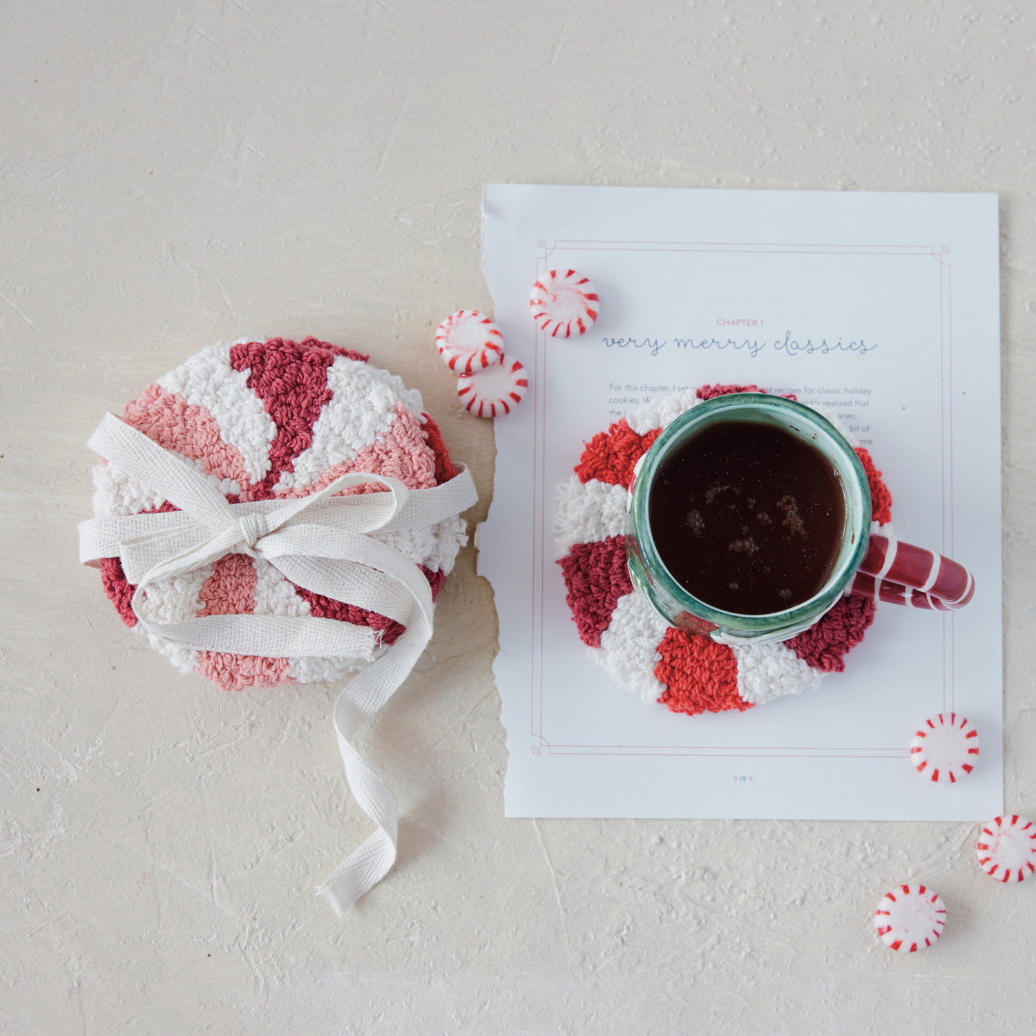 Cotton Tufted Candy Striped Coasters, Pink, Red & White, Set of 4 Tied with Cotton Tape
