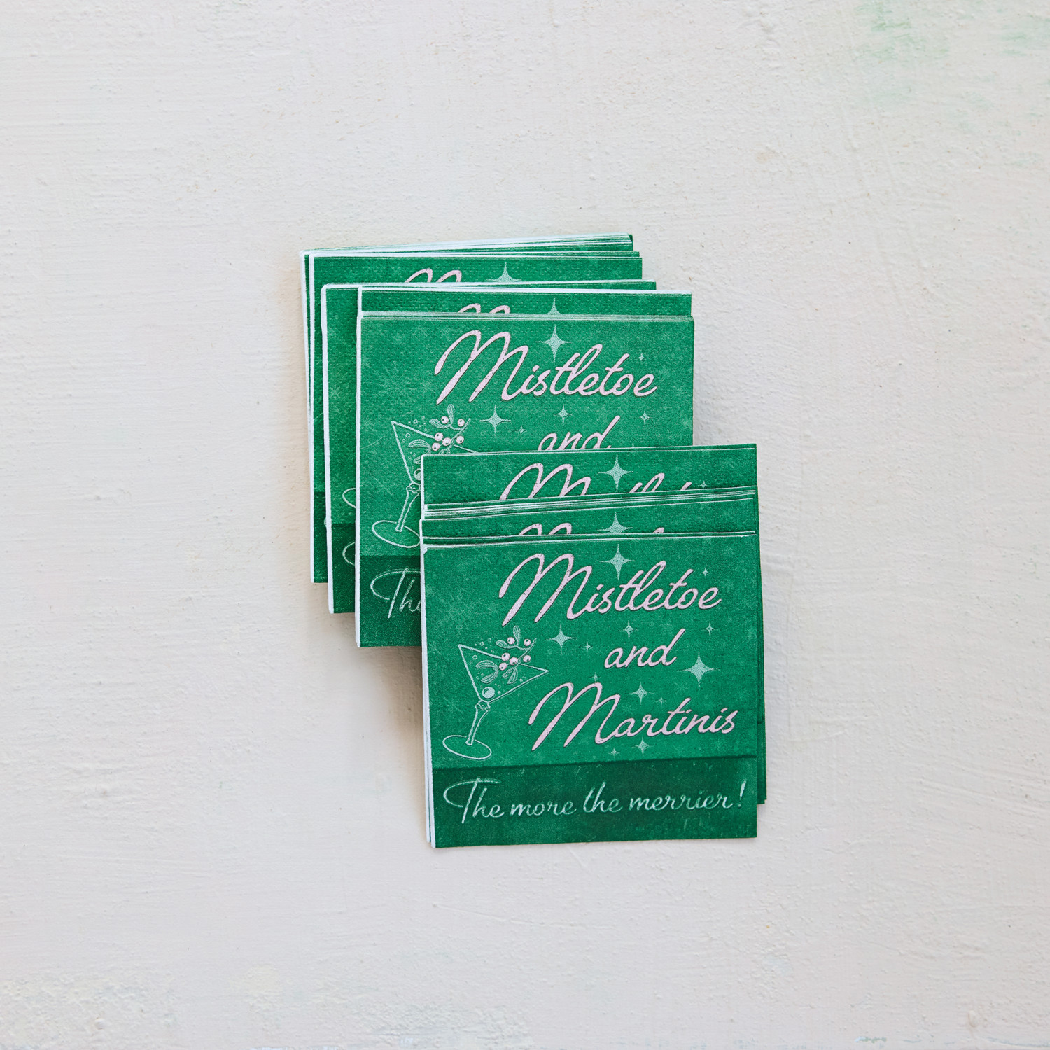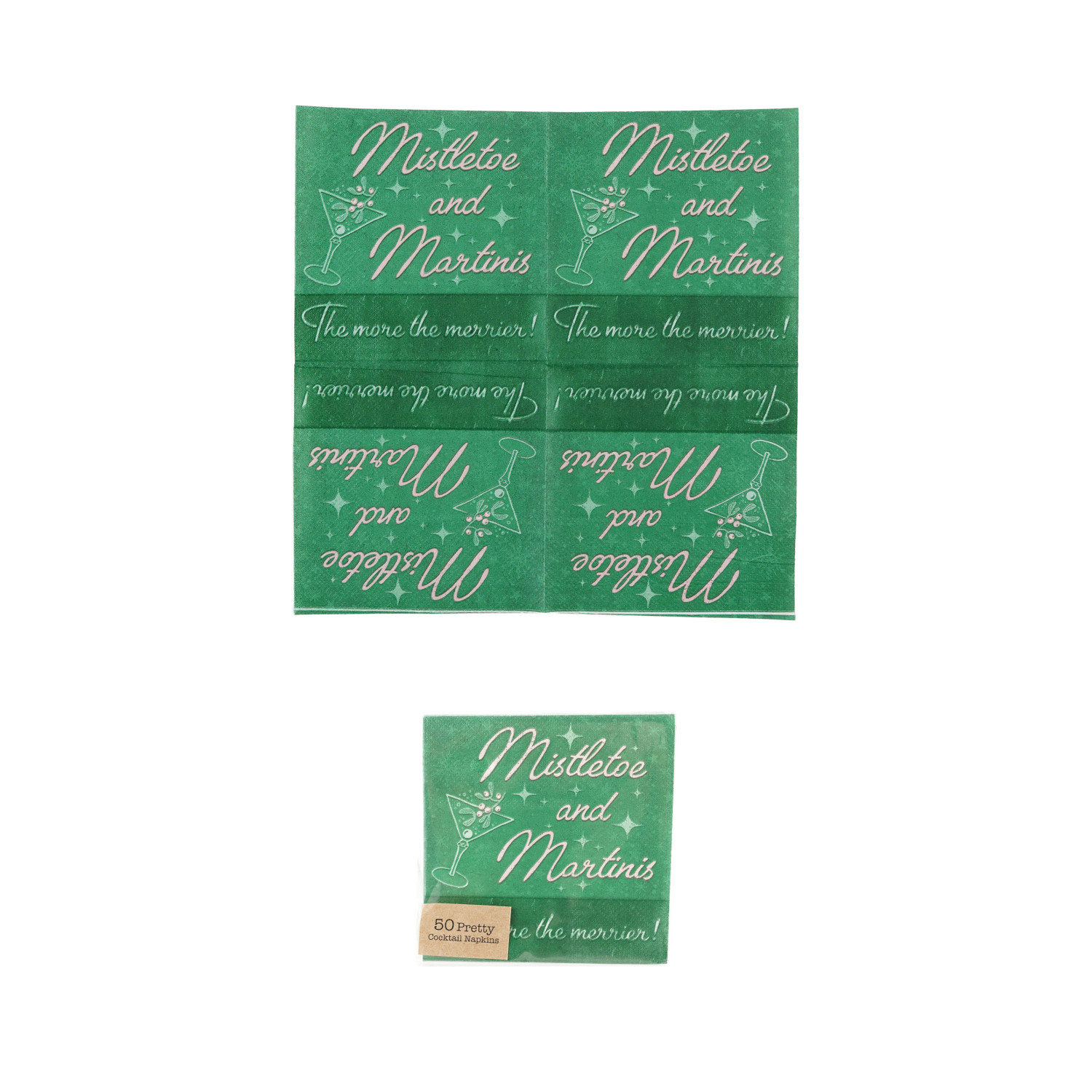 Catalog Name: 4" Square Paper Cocktail Napkins w/ Holiday Bar Image "Mistletoe and Martinis…", Green & Pink (Contains 50 Folded Pieces) ©