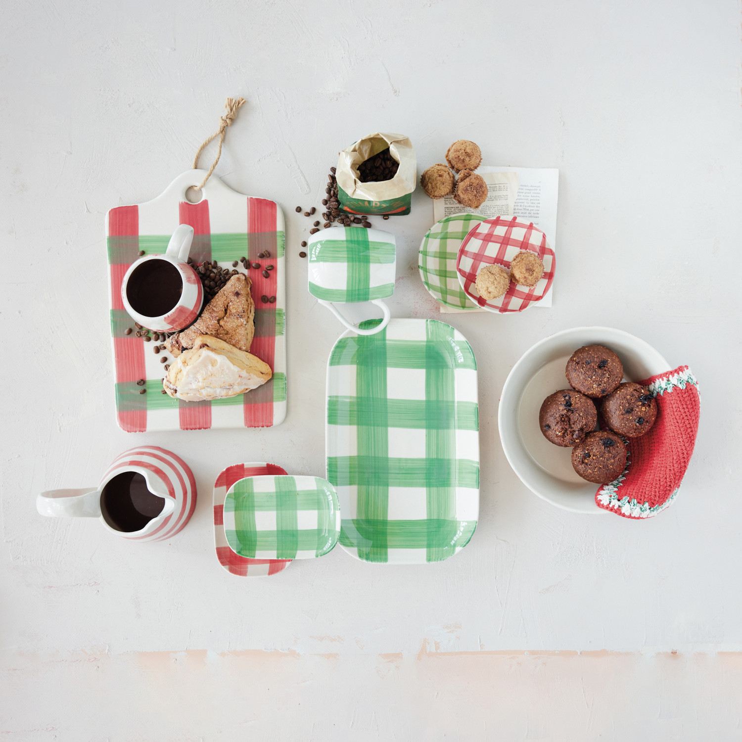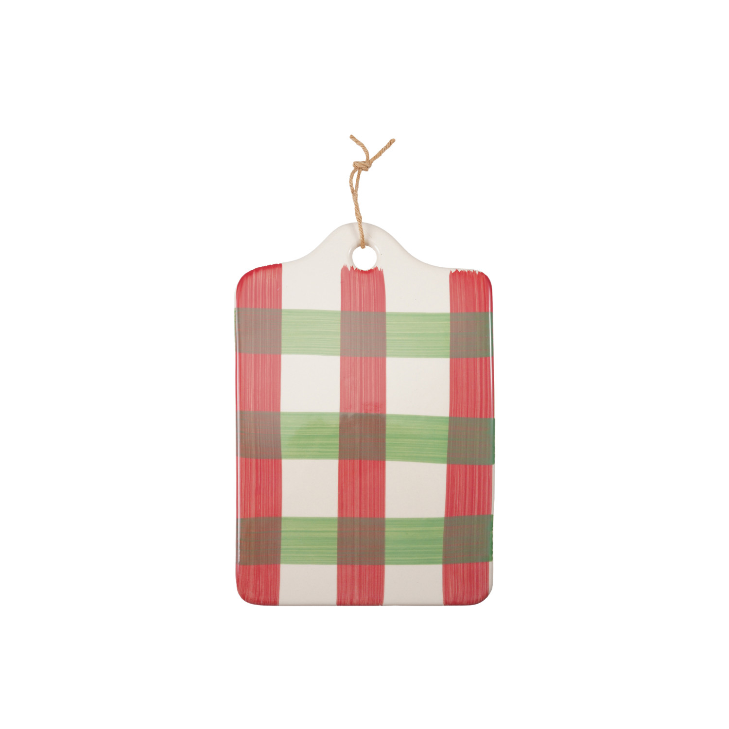 Catalog Name: 13-3/4"L x 9-1/4"W Hand-Painted Stoneware Cheese/Serving Board w/ Plaid Pattern, Red, Green & White (Each One Will Vary)