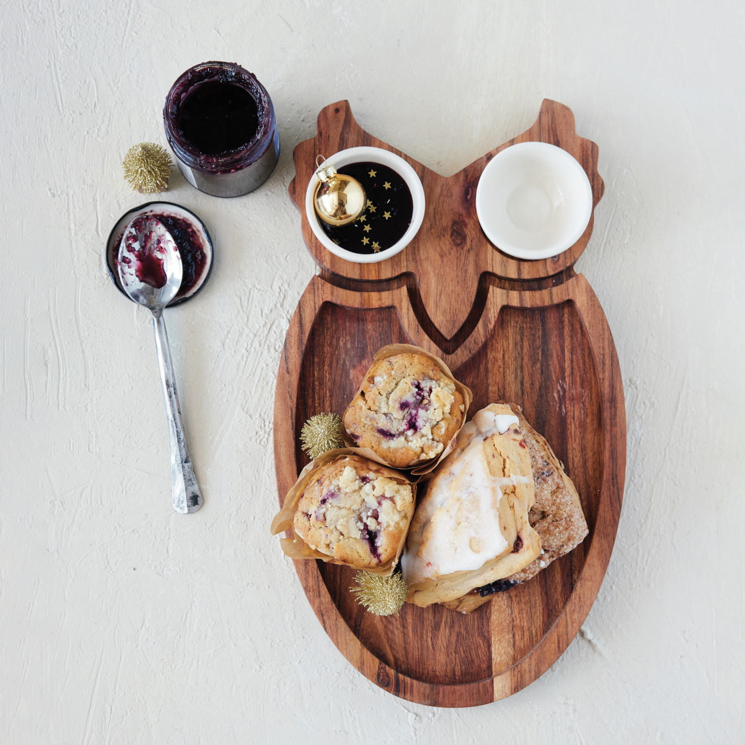 Acacia Wood Owl Shaped Platter with (2) 3" Round x 1-1/2"H Stoneware Bowls, Set of 3