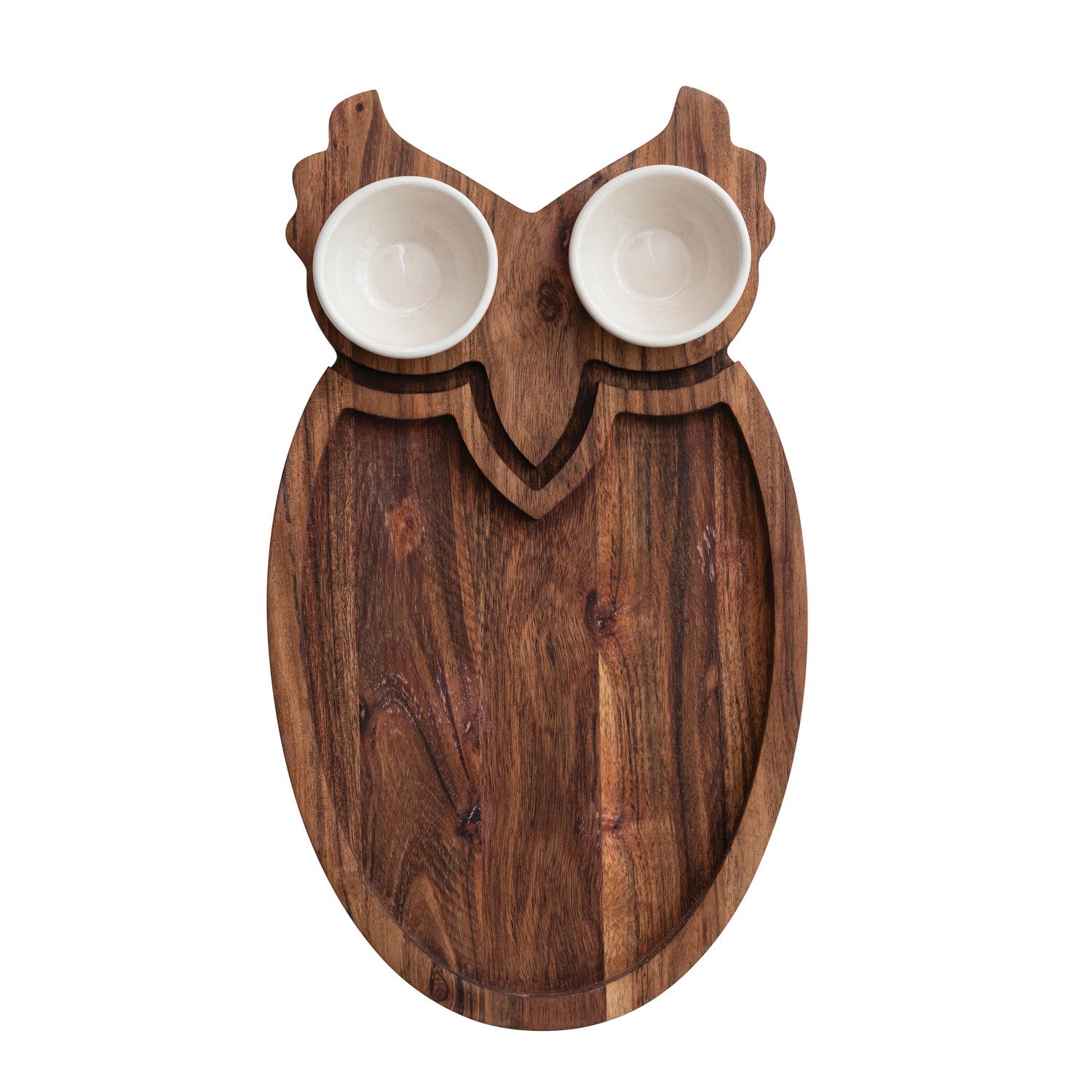 Catalog Name: 16"L x 9-1/4"W Acacia Wood Owl Shaped Platter w/ (2) 3" Round x 1-1/2"H Stoneware Bowls, Natural & White, Set of 3