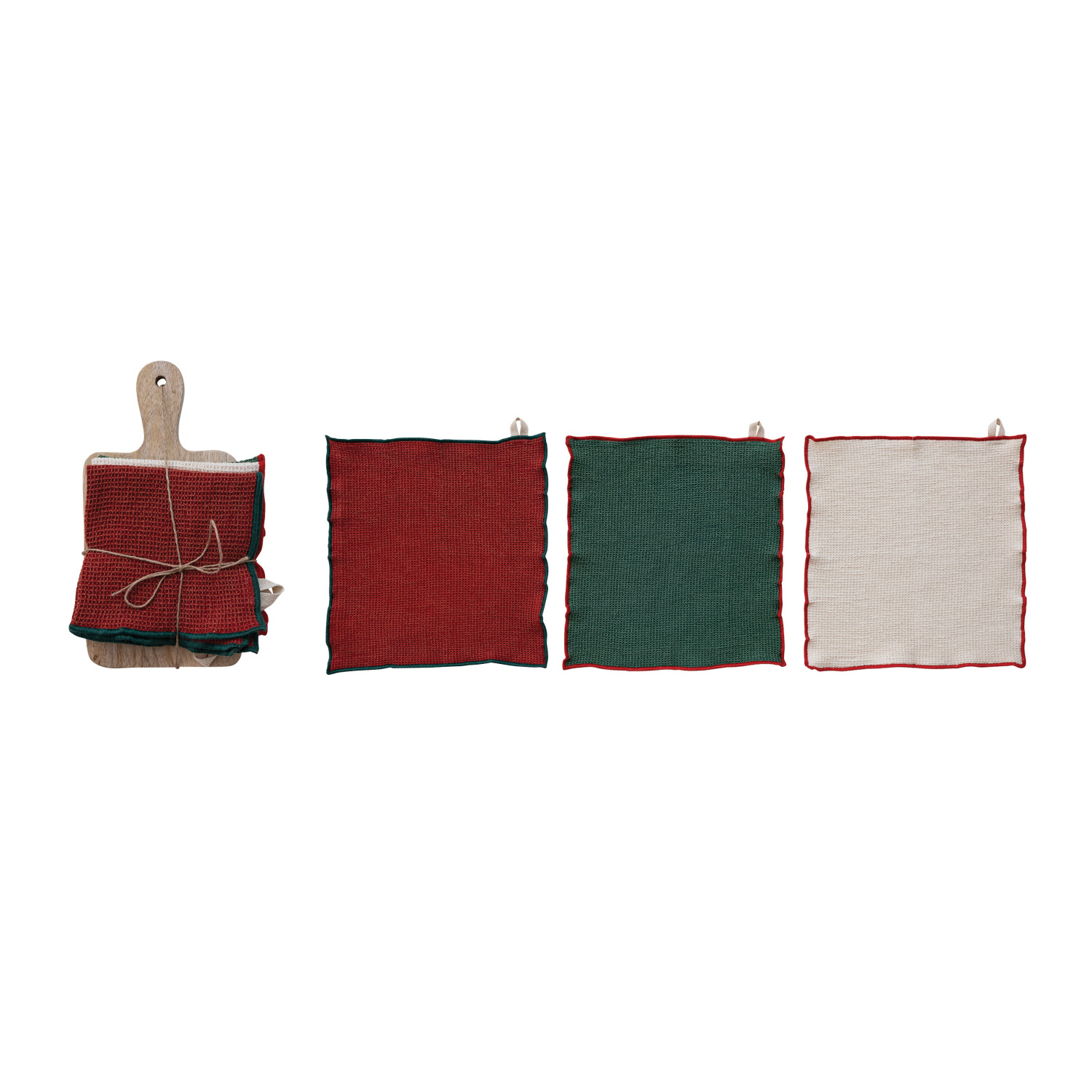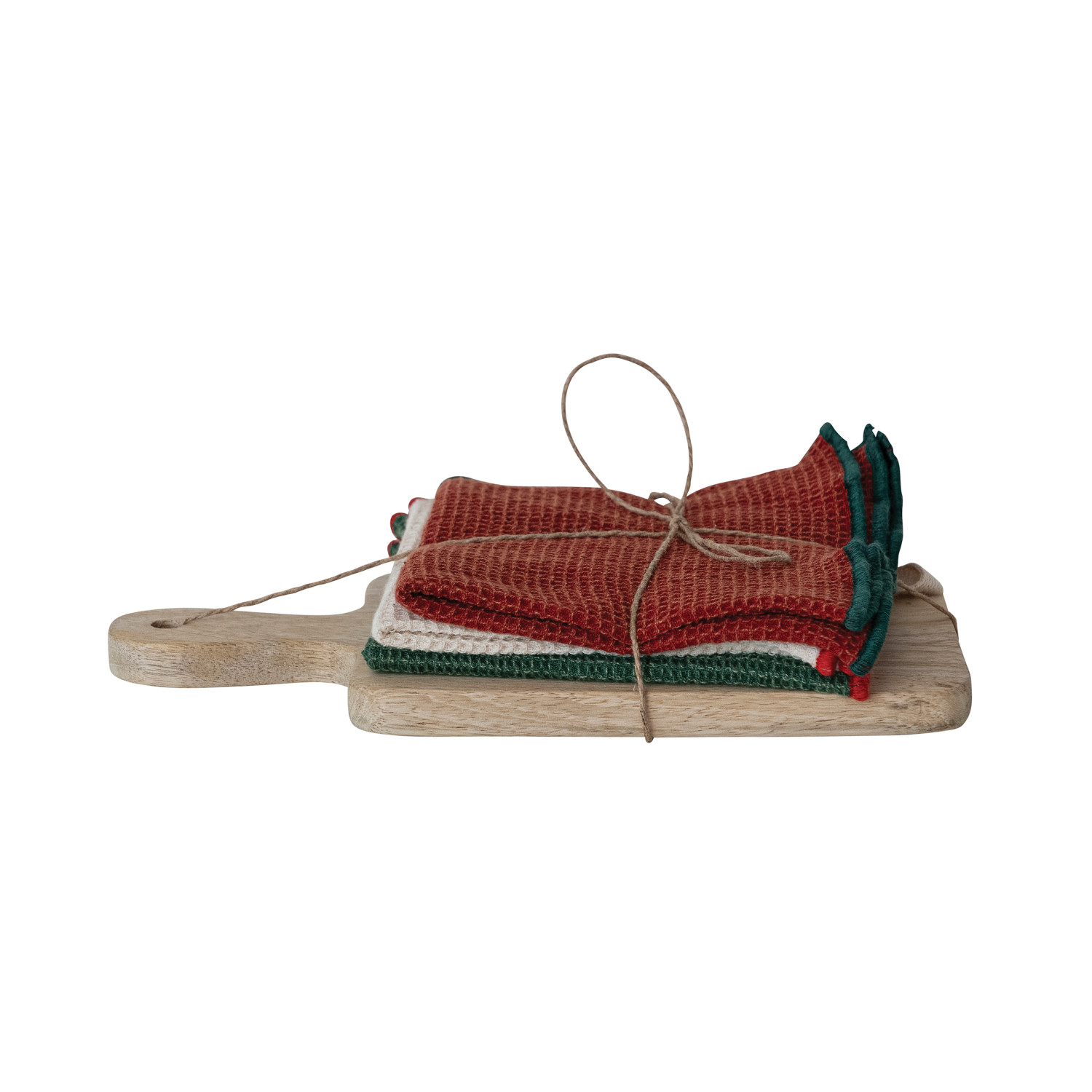Catalog Name: 10-1/2" Square (3) Cotton Waffle Weave Dish Cloths w/ Stitched Edge, Loop & 10"L x 5"W Mango Wood Cheese/Serving Board w/ Handle, Set of 4 Tied w/ Jute