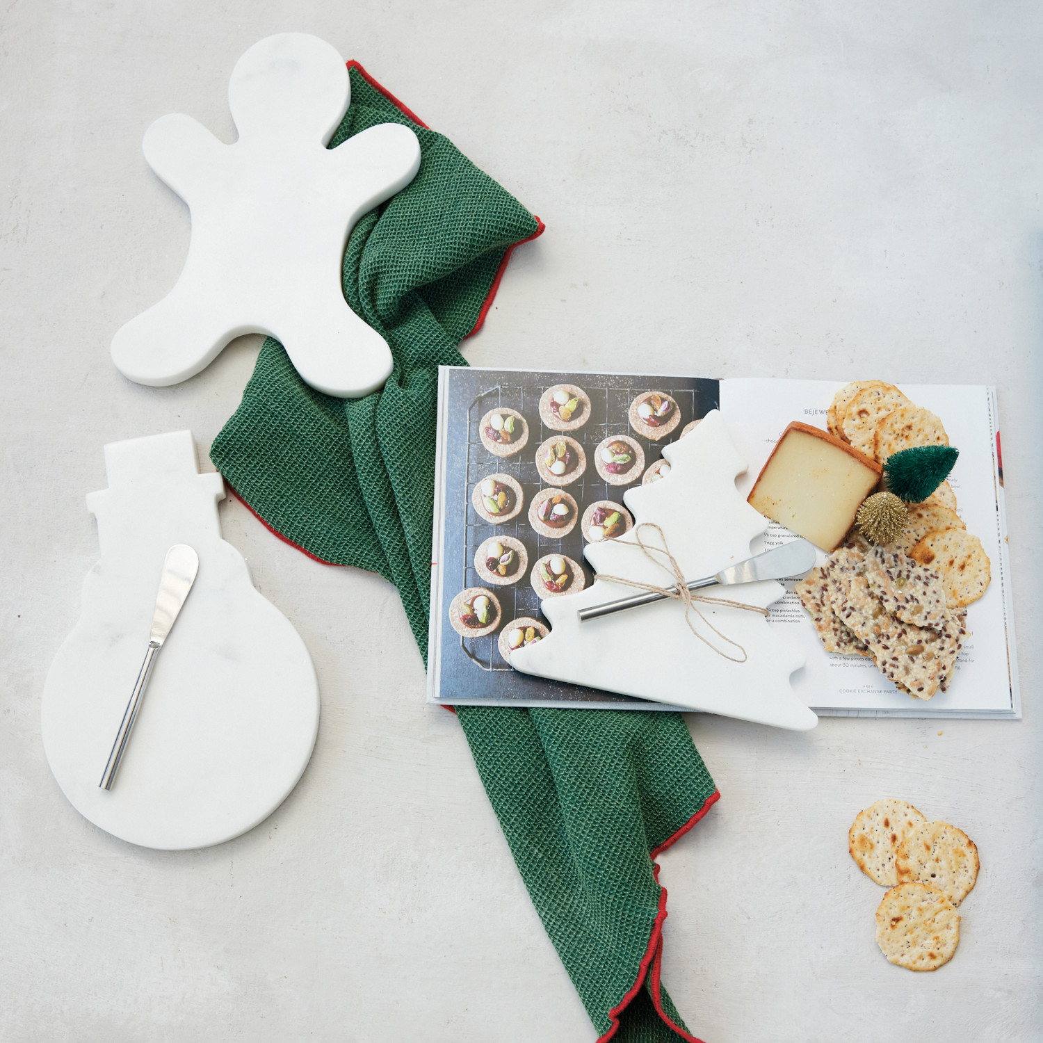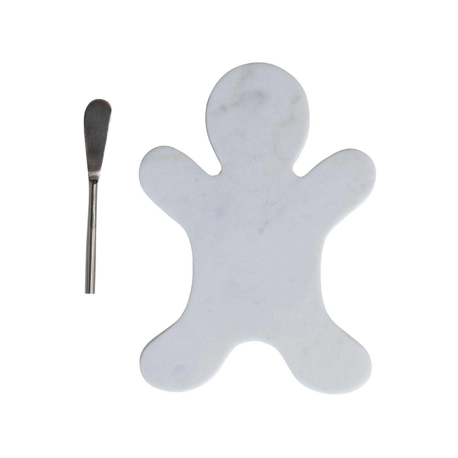 Catalog Name: 11"L x 8"W Marble Gingerbread Shaped Cheese/Serving Board w/ Stainless Steel Canape Knife, White & Nickel Finish, Set of 2 Tied w/ Jute