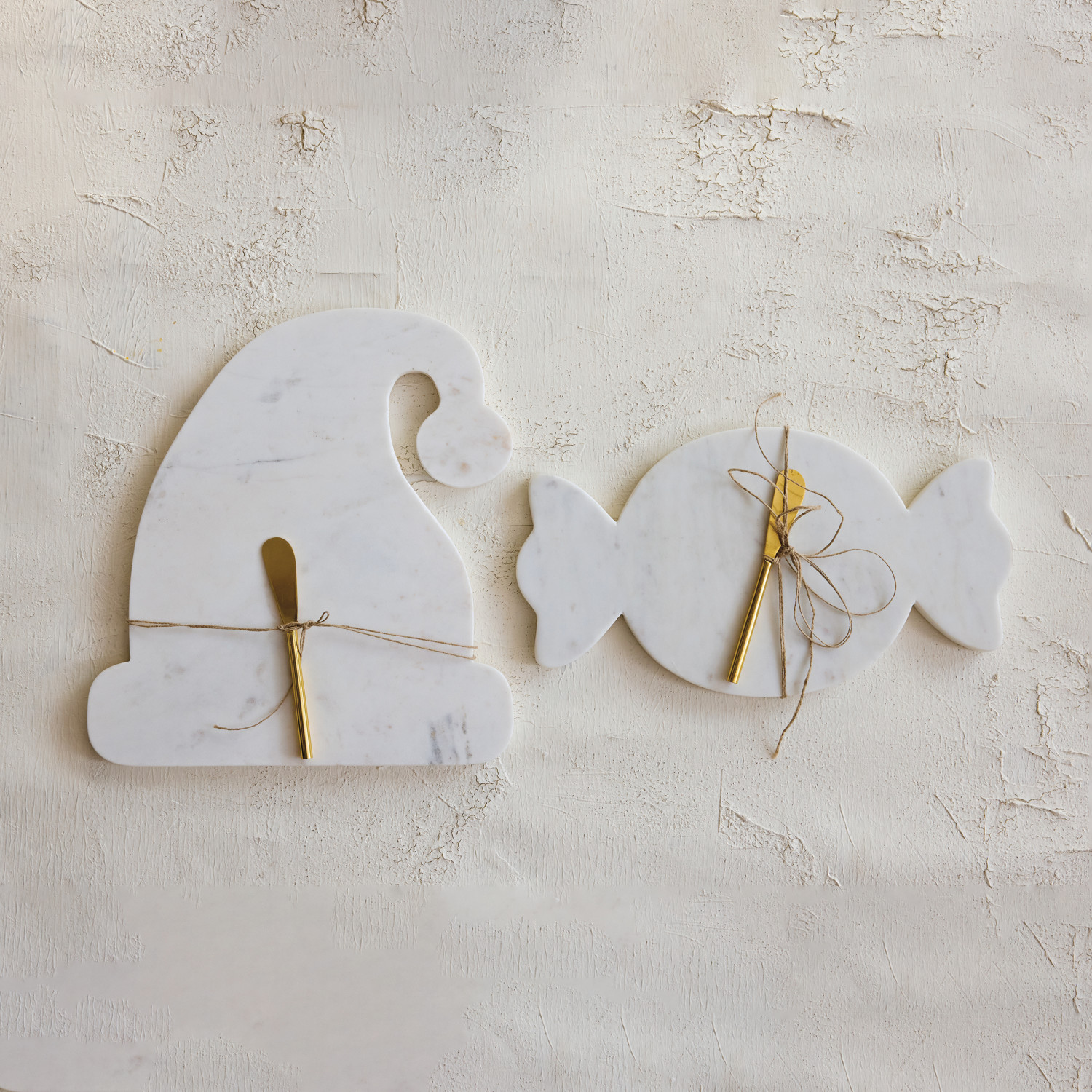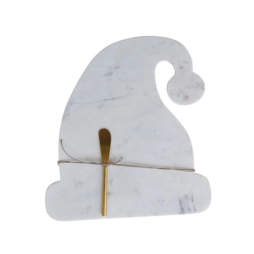 Catalog Name: 13-1/2"L x 12-1/2"W Marble Santa Hat Shaped Cheese/Serving Board w/ Stainless Steel Canape Knife, White & Gold Finish, Set of 2 Tied w/ Jute