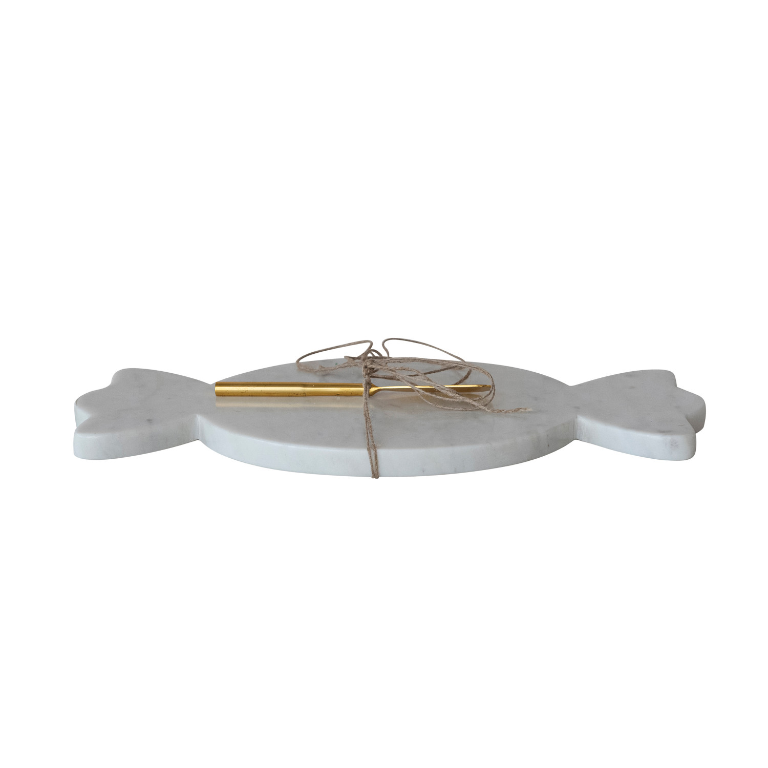 Catalog Name: 14-3/4"L x 8"W Marble Candy Shaped Cheese/Serving Board w/ Stainless Steel Canape Knife, White & Gold Finish, Set of 2 Tied w/ Jute