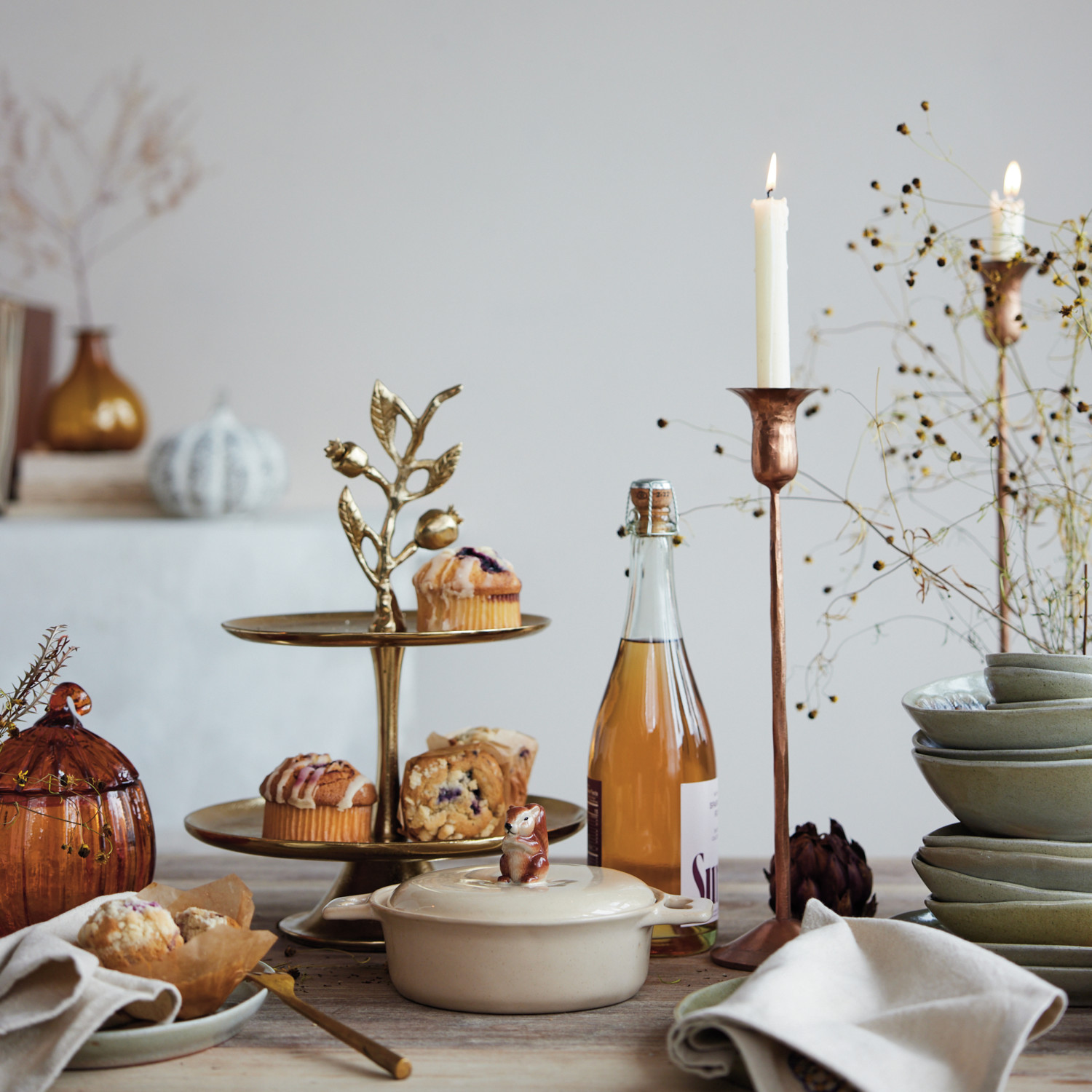 2 Cup Stoneware Baker with Squirrel Finial & Handles, Brown & Beige