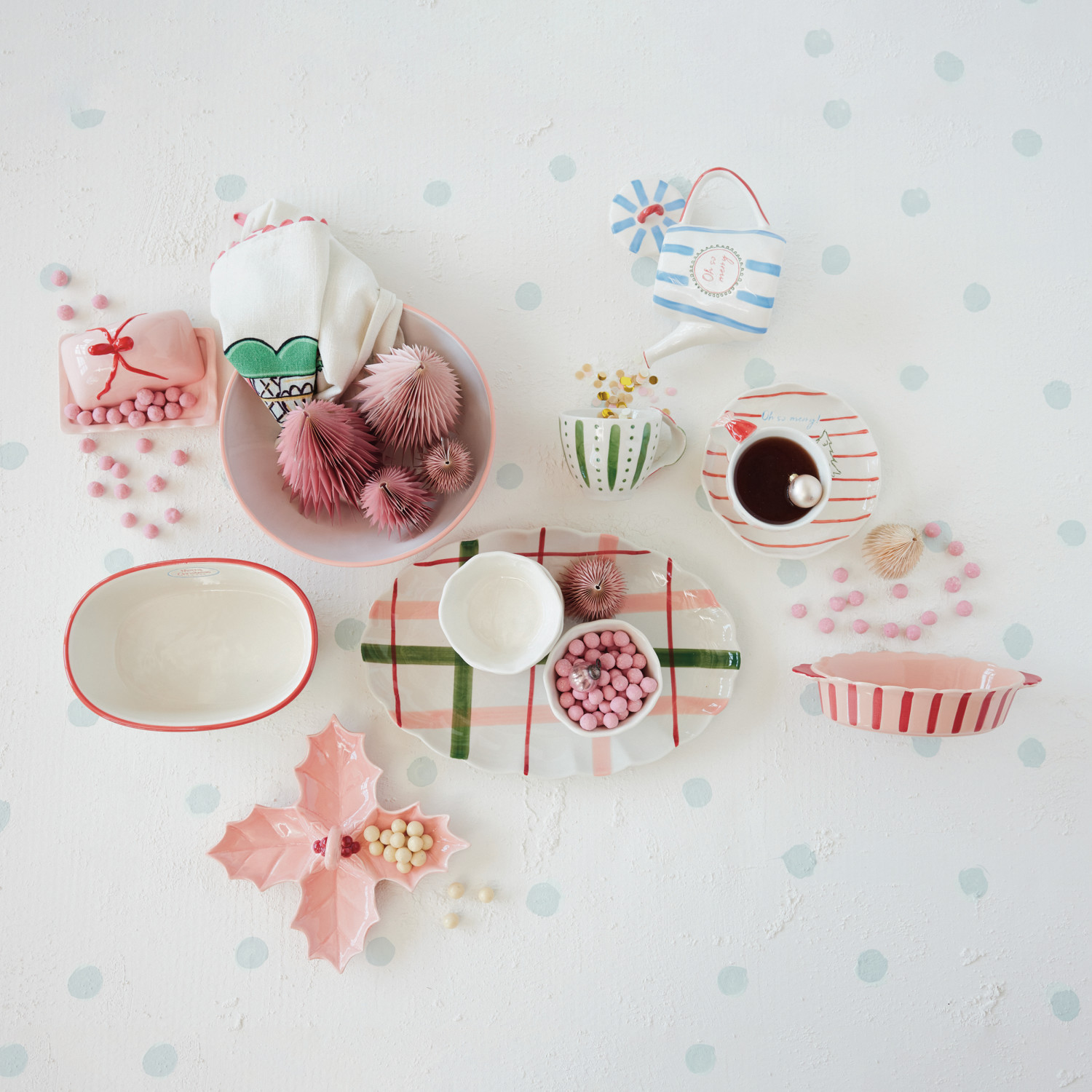 Catalog Name: 10"L x 7"W x 3-1/2"H 2 Quart Oval Stoneware Striped Baker "Merry Christmas", Multi Color