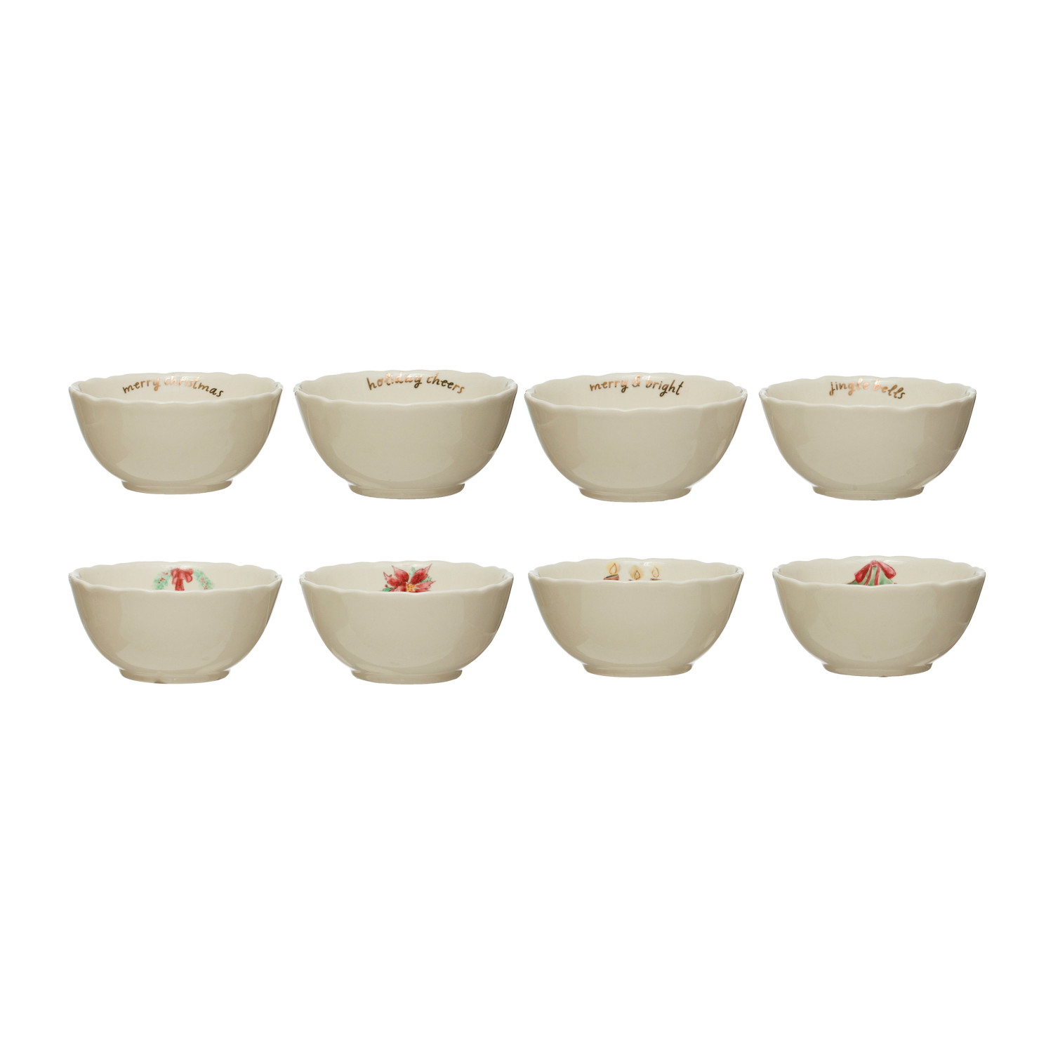 Catalog Name: 4-1/2" Round x 2"H Stoneware Bowl w/ Holiday Greeting/Greenery & Gold Electroplating, Multi Color, 4 Styles ©