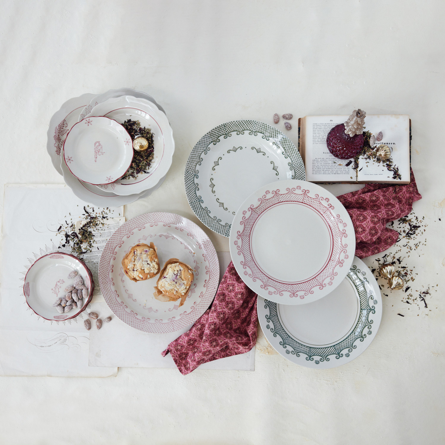 Stoneware Scalloped Plate with Botanicals, White & Burgundy
