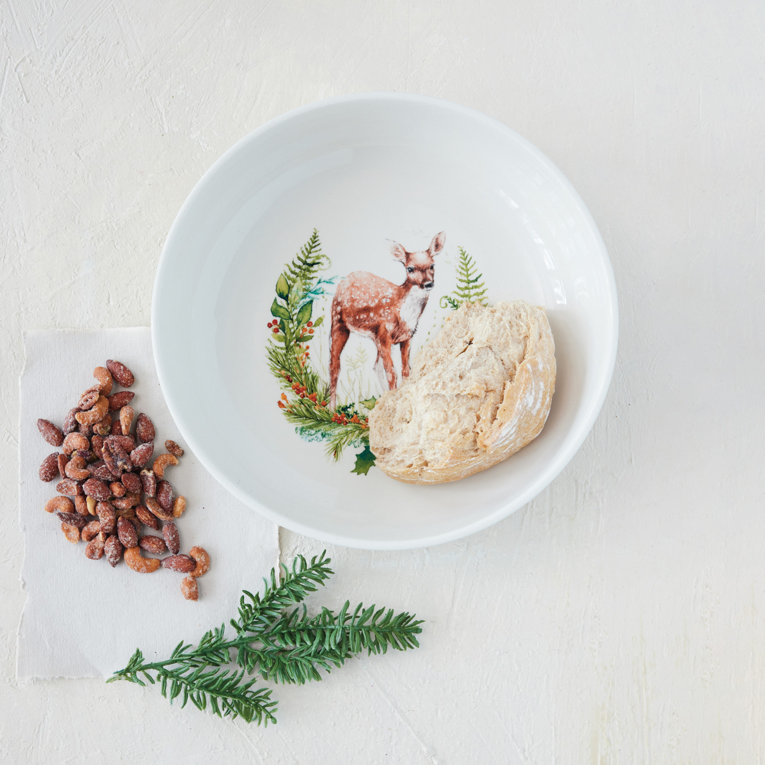 Stoneware Low Bowl with Deer & Seasonal Botanicals ©