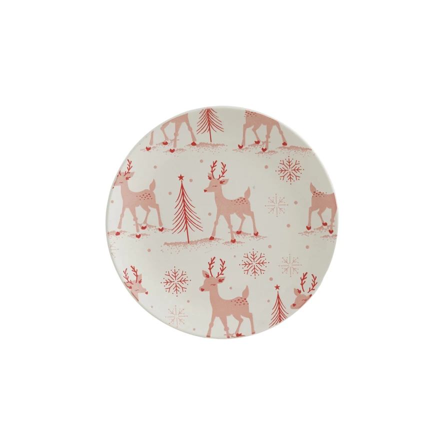 Stoneware Plate with Reindeer, Trees & Snowflakes Pattern, White & Pink