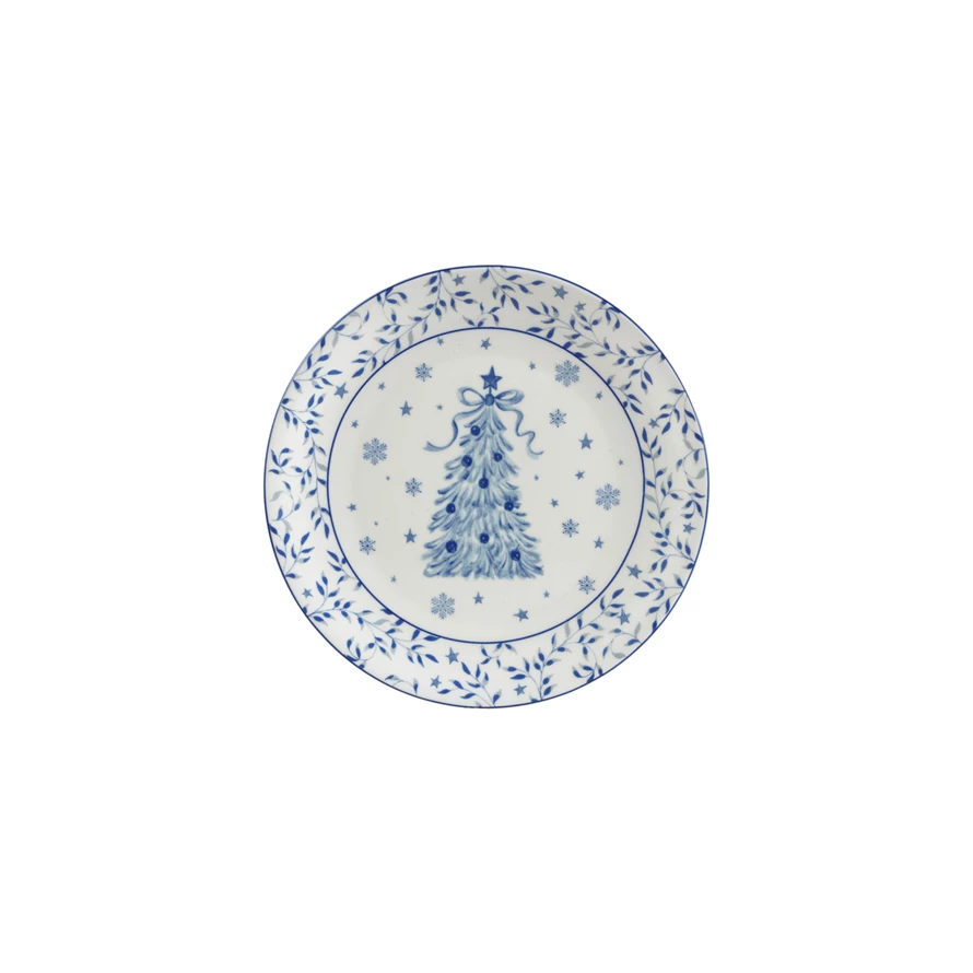 Catalog Name: 8" Round Stoneware Plate w/ Tree, White & Blue