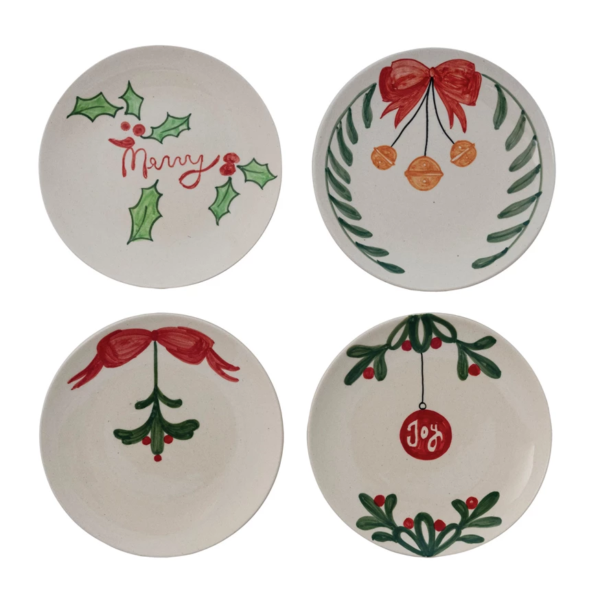 Catalog Name: 8" Round Hand-Painted Stoneware Plate w/ Holiday Botanicals/Word, Multi Color, 4 Styles (Each One Will Vary)