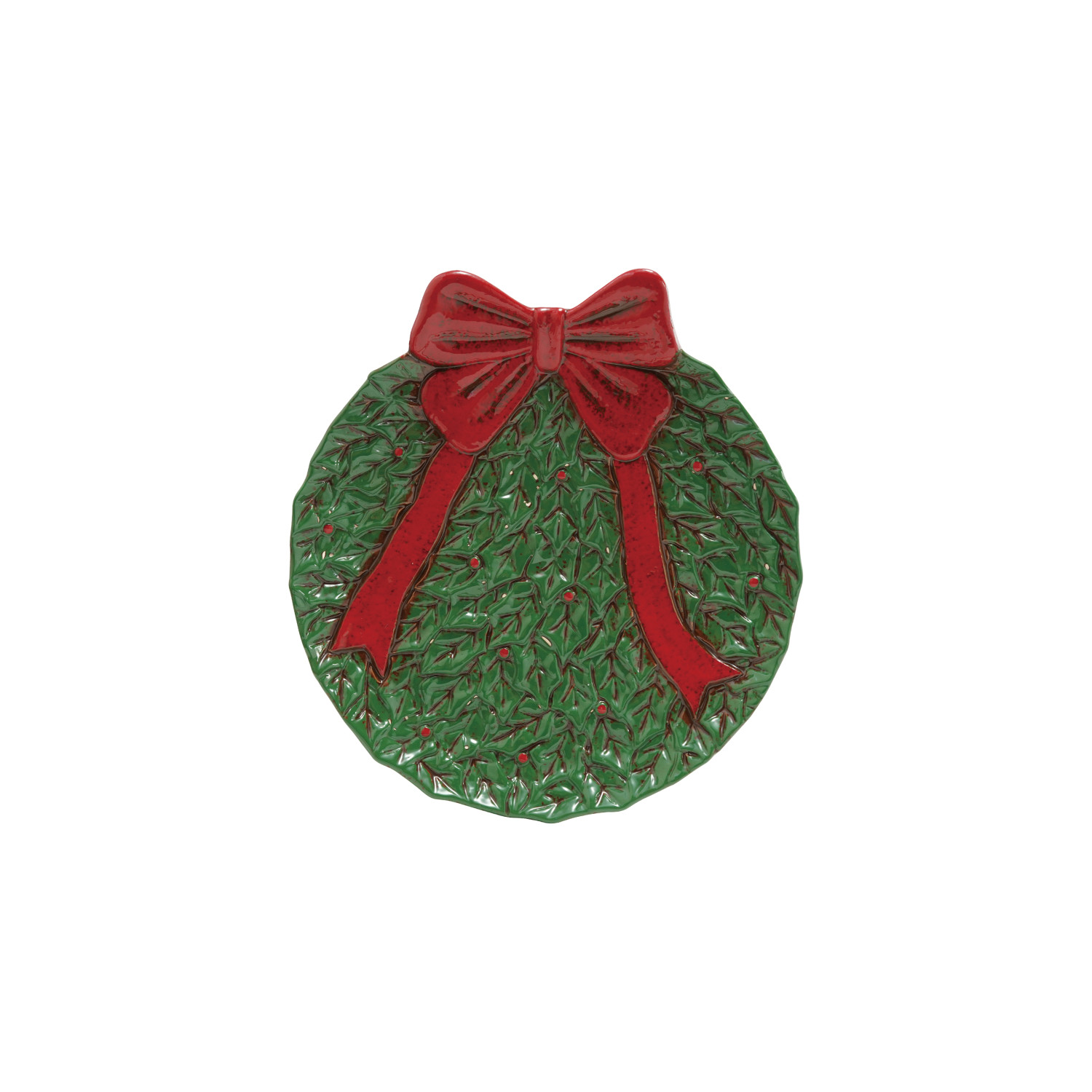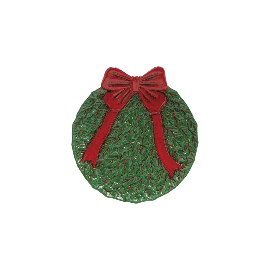 Catalog Name: 10"L x 9-1/4"W Hand-Painted Ceramic Wreath Shaped Plate w/ Bow, Reactive Glaze, Red & Green (Each One Will Vary)
