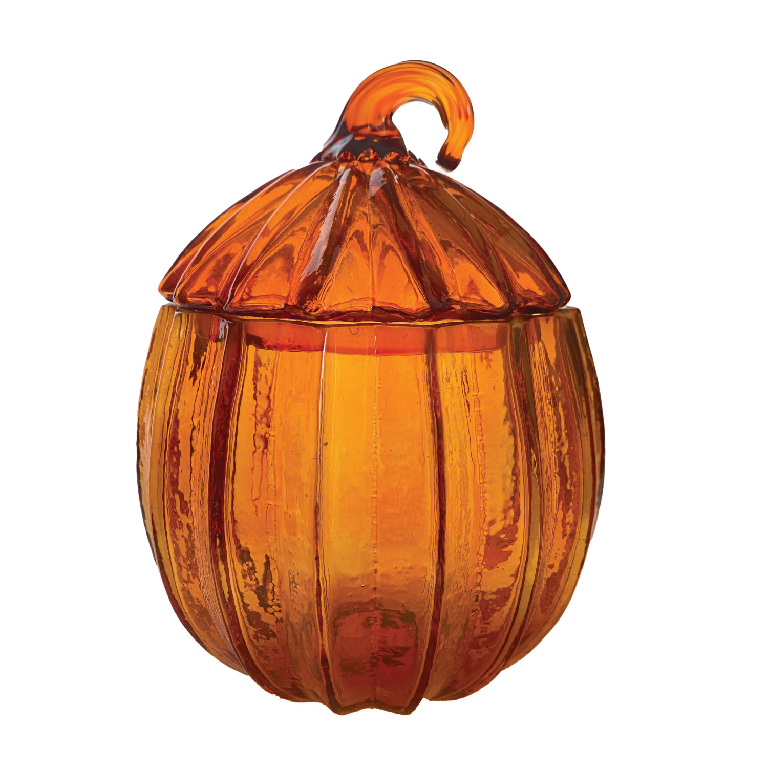 Hand-Blown Glass Pumpkin Shaped Jar with Lid, Amber Color