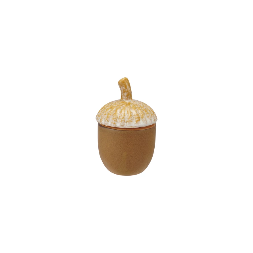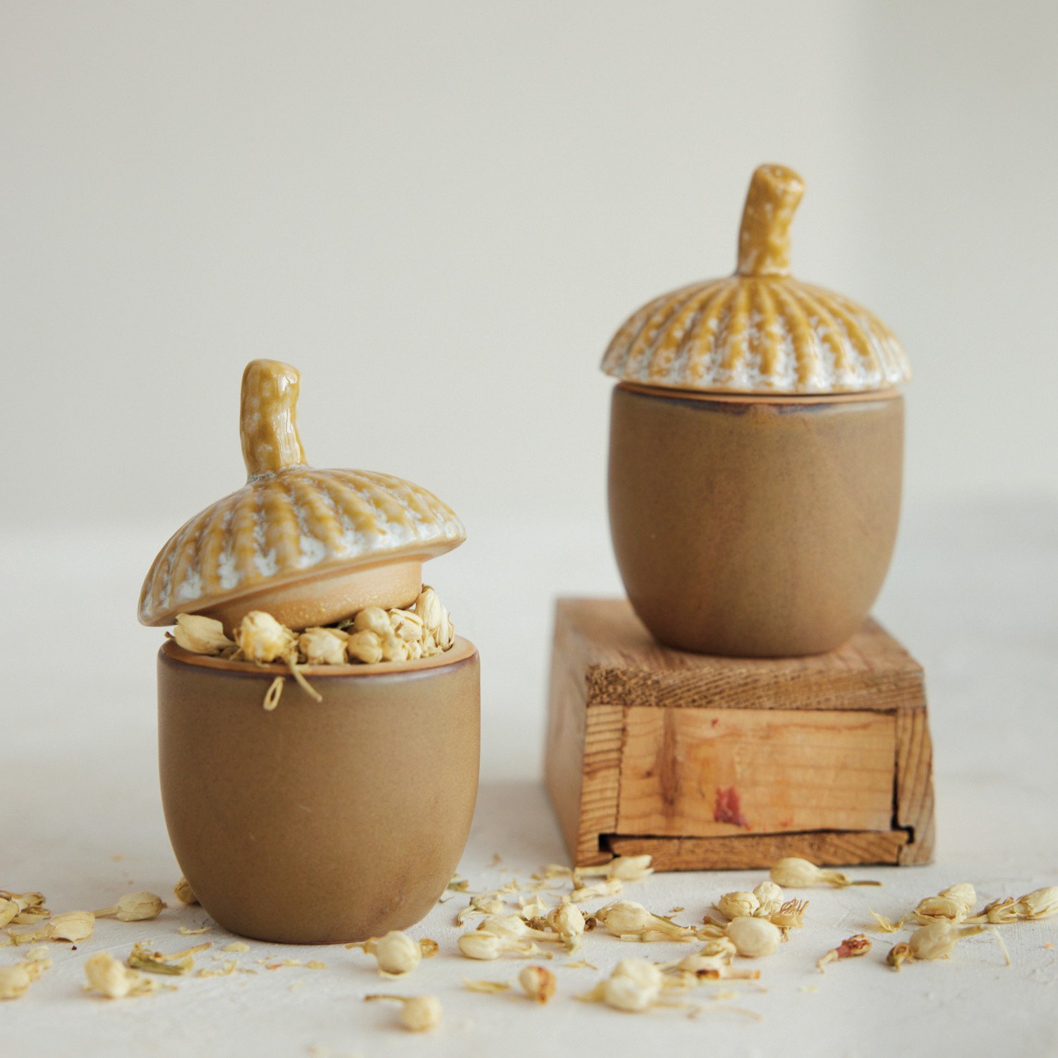 Catalog Name: 2-1/4" Round x 3-1/2"H Stoneware Acorn Shaped Jar w/ Lid, Matte Reactive Glaze, Brown & Tan Color (Each One Will Vary)