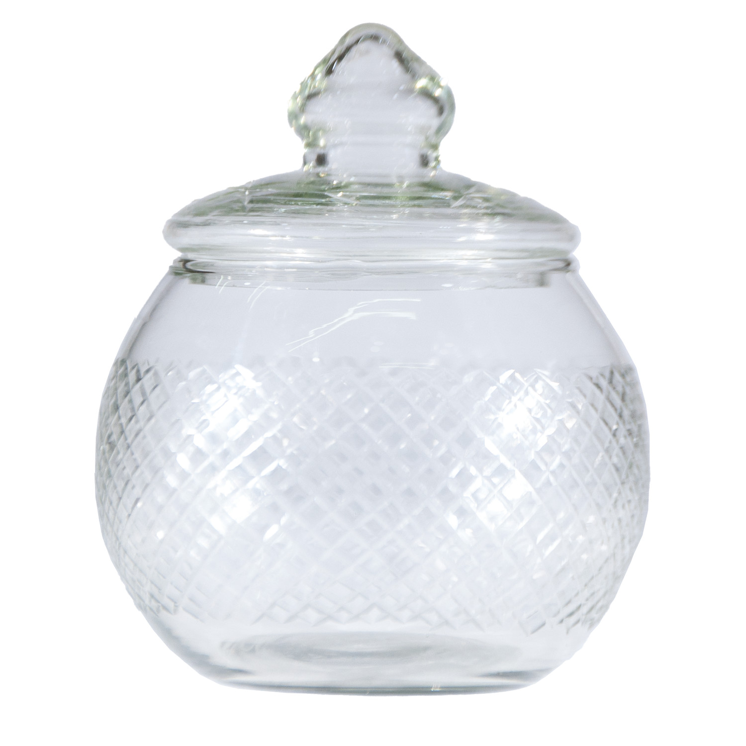 Catalog Name: 5" Round x 5-3/4"H 24 oz. Cut Hand-Blown Glass Jar w/ Lid