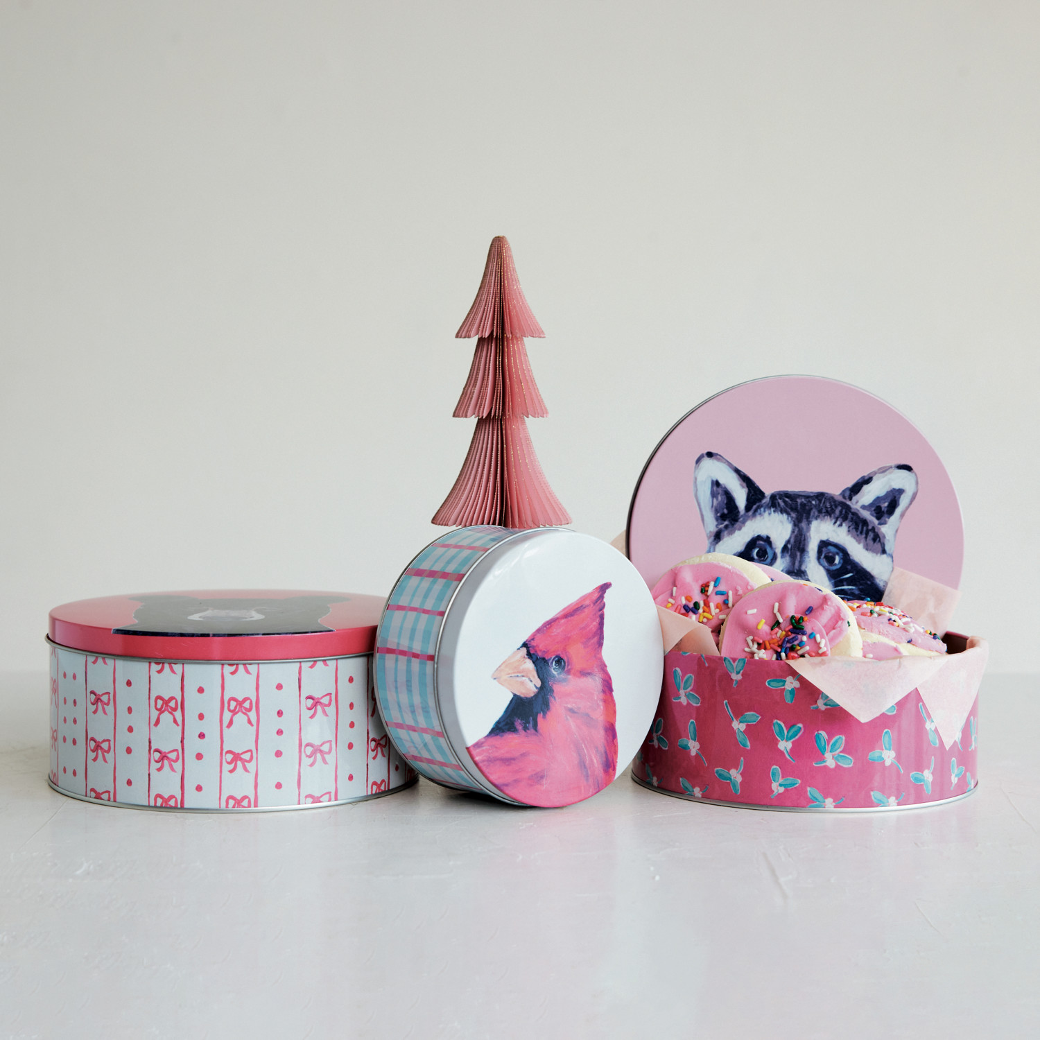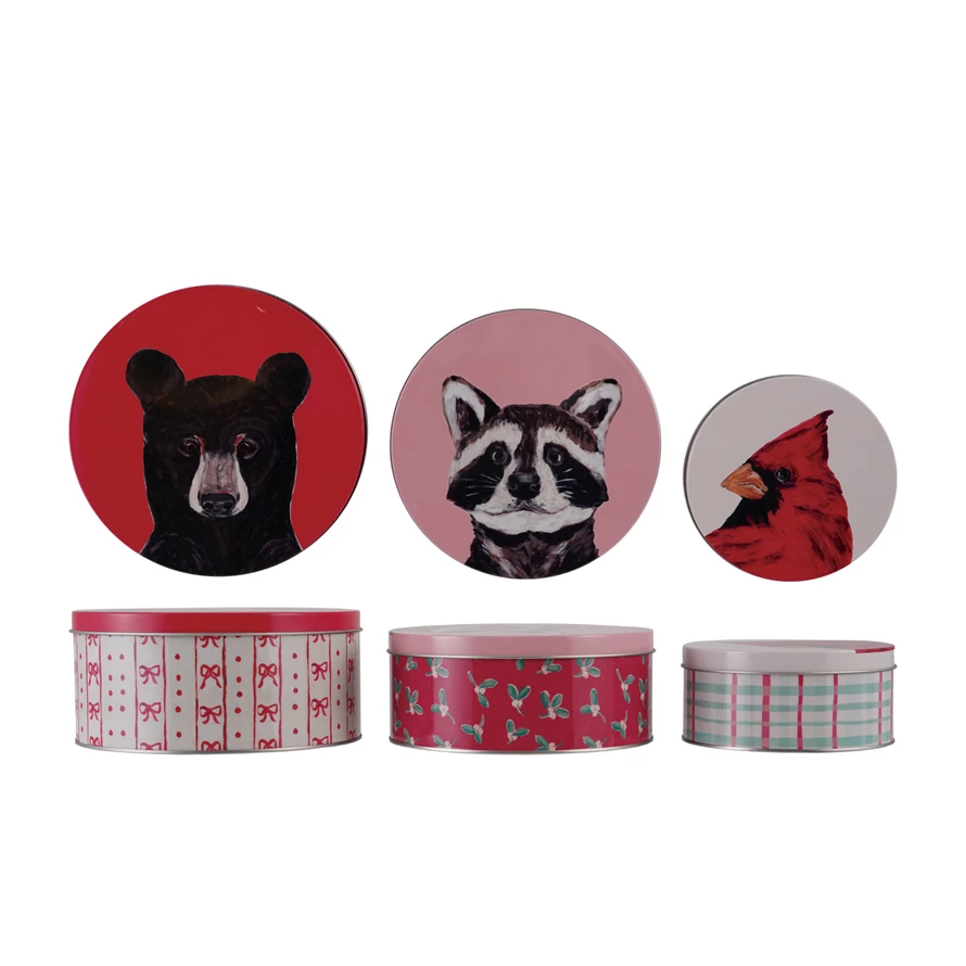 Embossed Tins with Lids, Holiday Patterns & Animals, Set of 3 ©