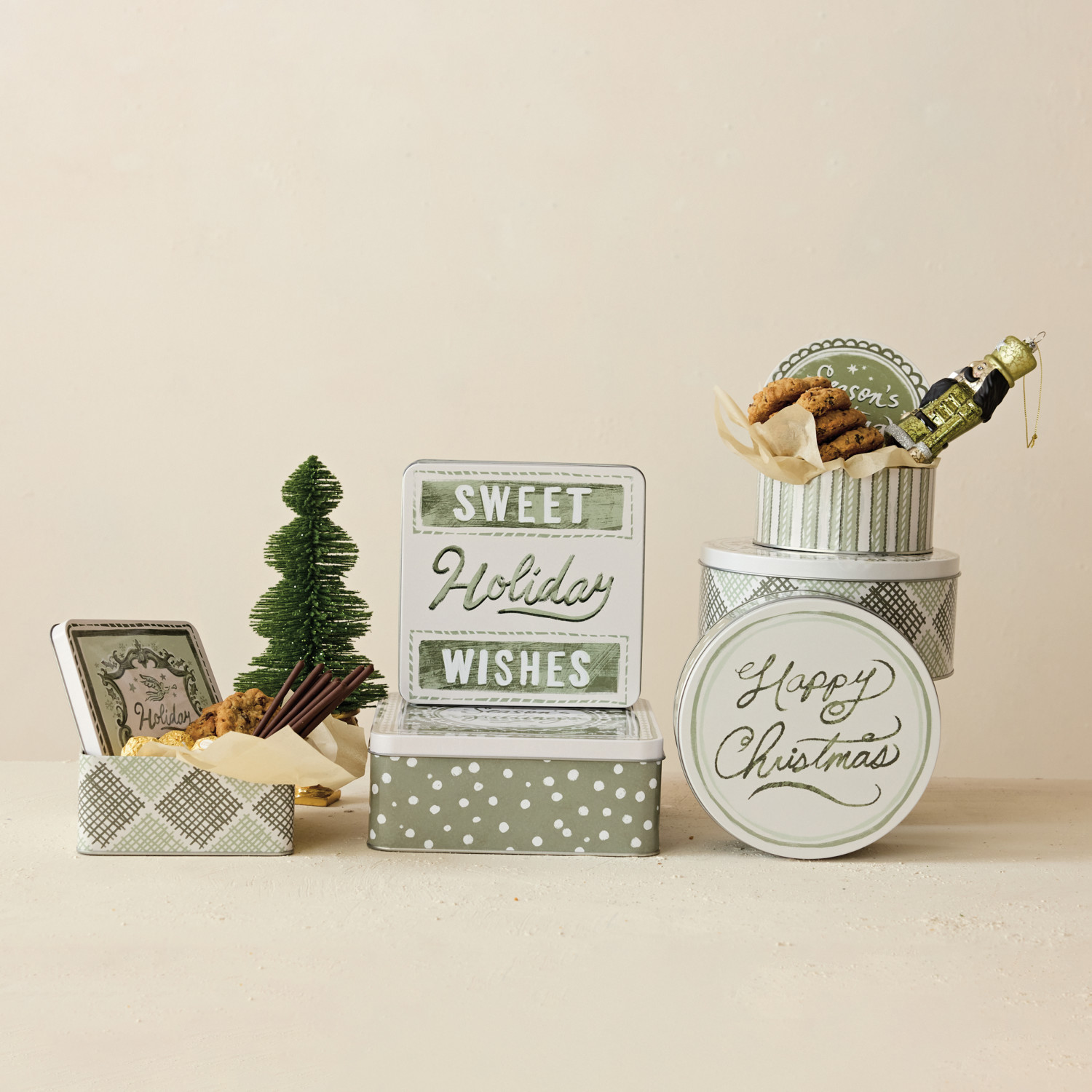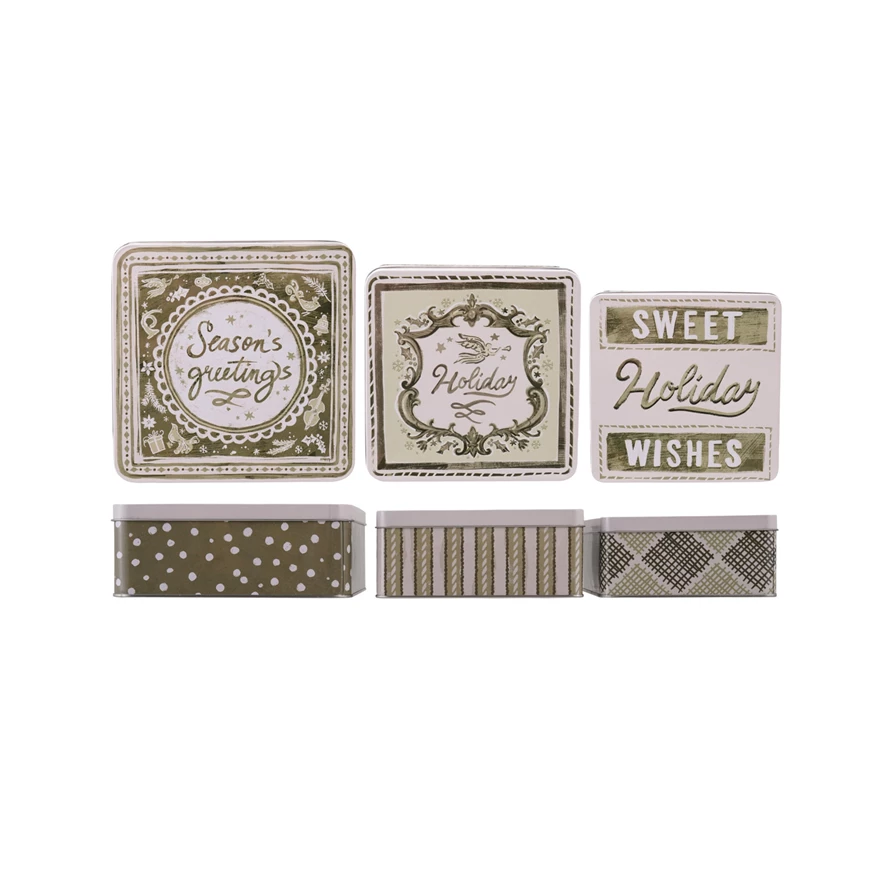 Catalog Name: 8-1/4" Square x 3-1/4"H, 7" Square x 3"H & 6" Square x 2-3/4"H Embossed Tins w/ Lids, Holiday Patterns & Sayings, Green & Cream Color, Set of 3 ©