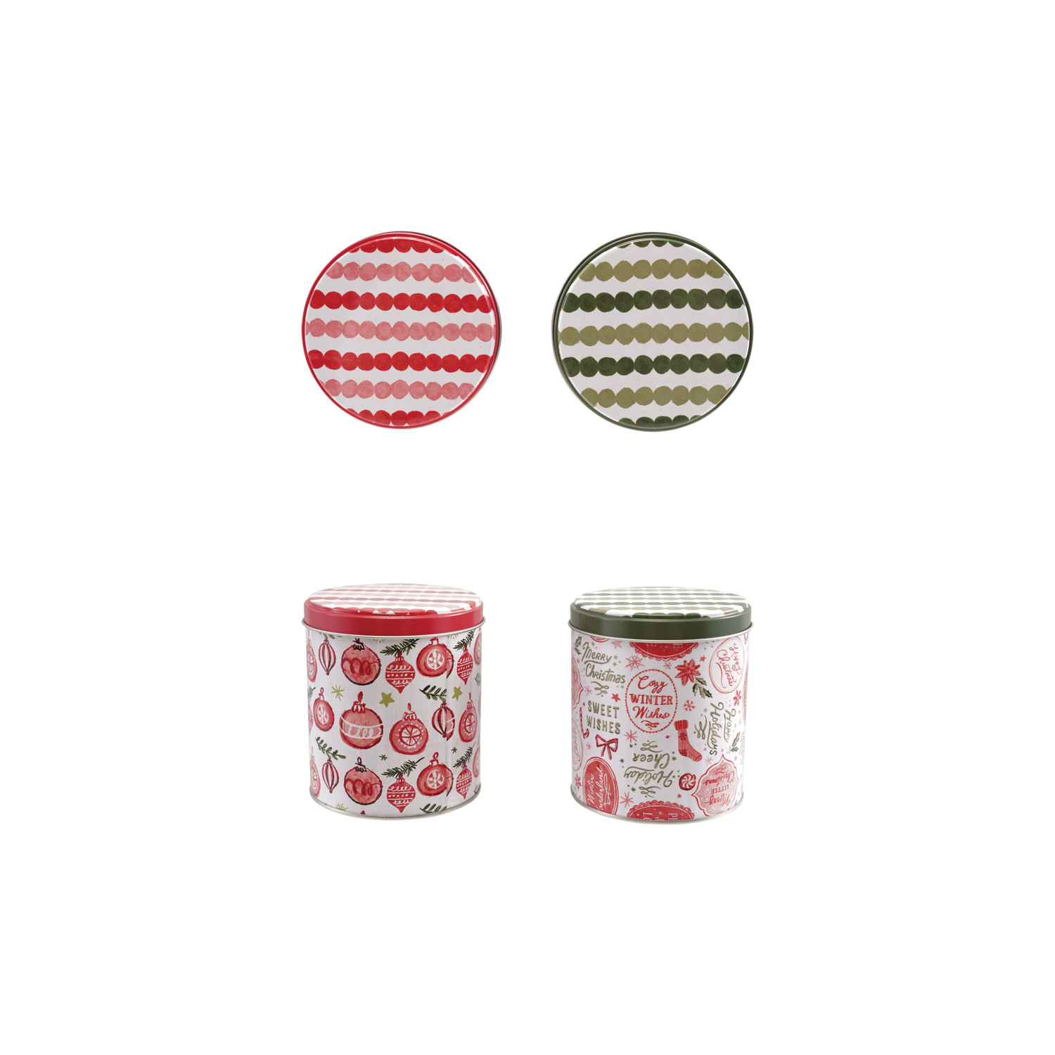 Catalog Name: 4" Round x 4-1/2"H Tin Container w/ Lid & Holiday Pattern, Multi Color, 2 Styles ©