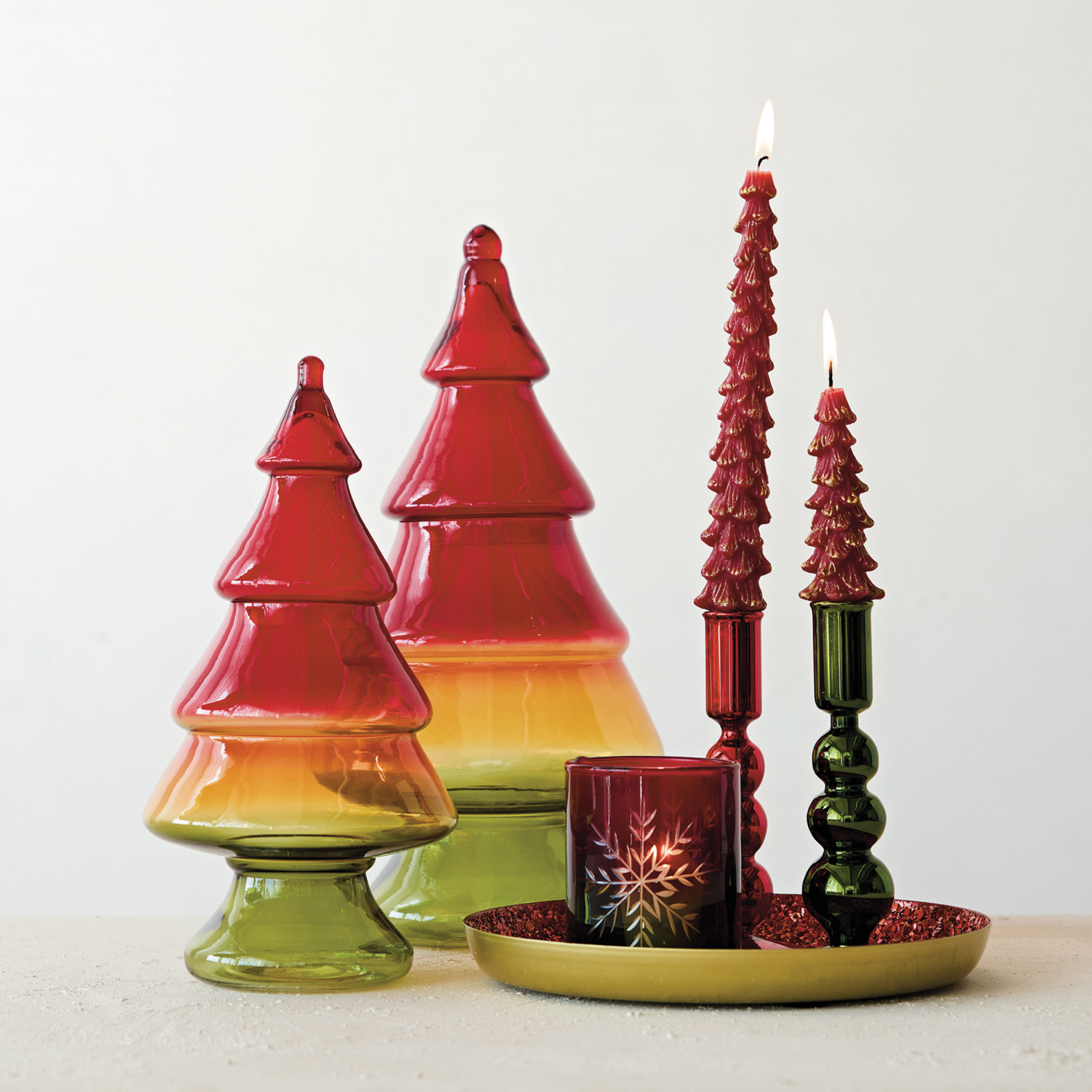 Hand-Blown Glass Tree Shaped Jar with Lid, Red