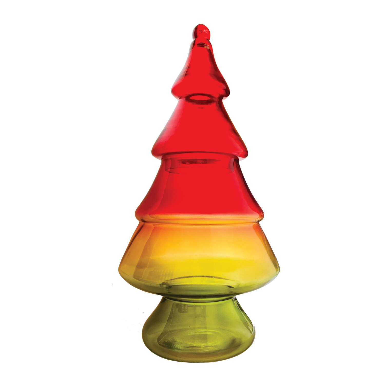 Catalog Name: 7-3/4" Round x 15"H Hand-Blown Glass Tree Shaped Jar w/ Lid, Red, Yellow & Green