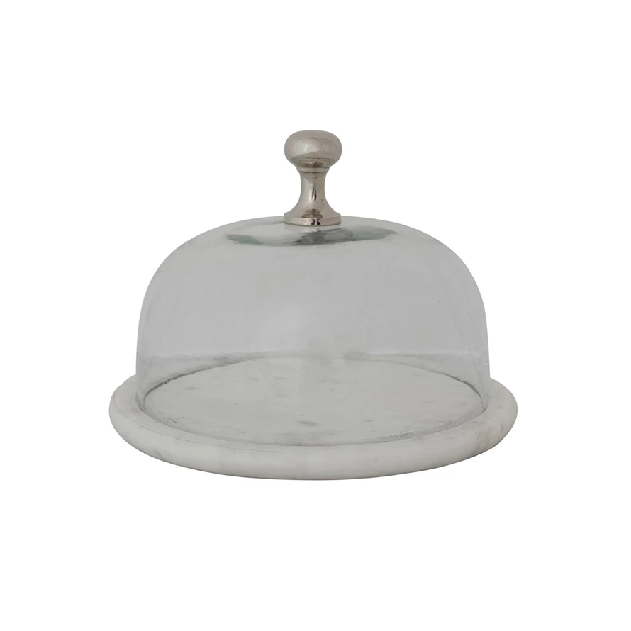 Catalog Name: 9" Round x 6-1/2"H Glass Cloche w/ Marble Base & Aluminum Handle, White & Nickel Finish, Set of 2