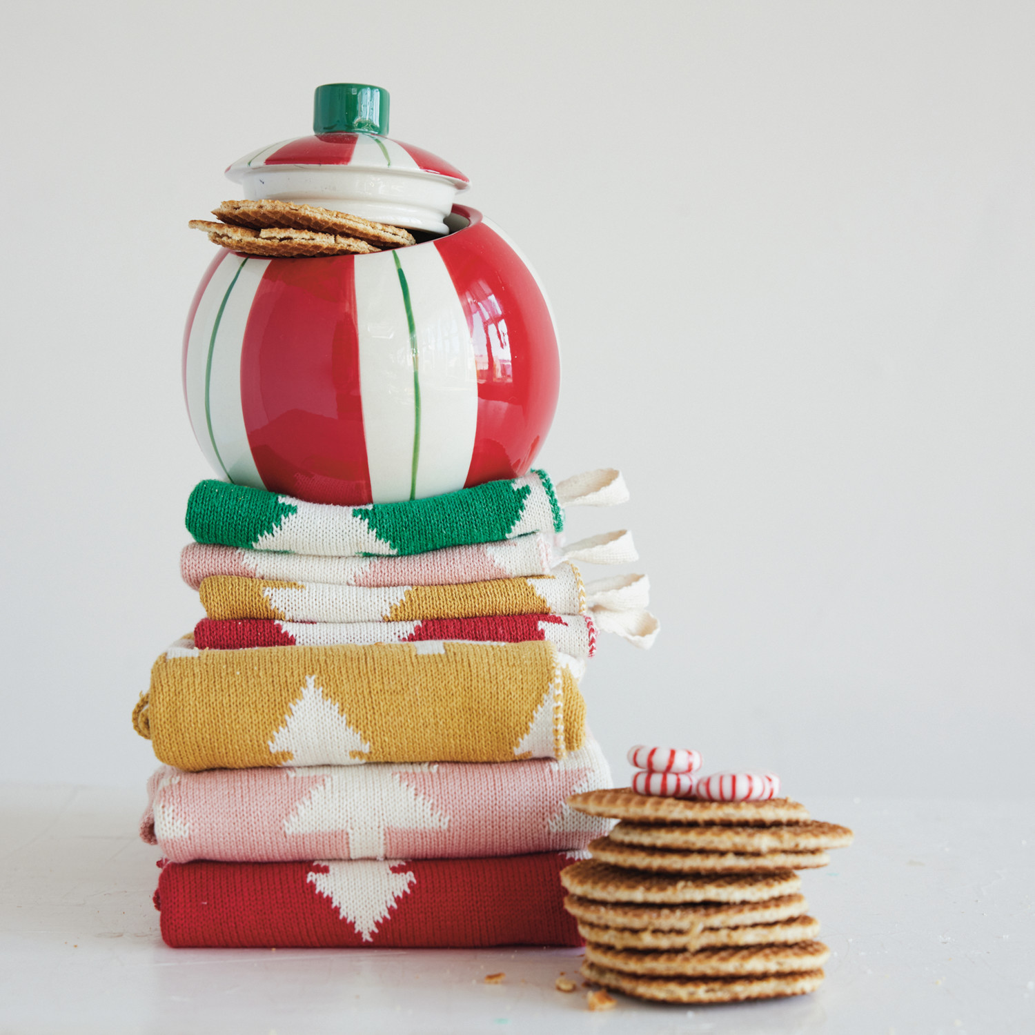 Catalog Name: 6" Round x 6-1/4"H Hand-Painted Stoneware Candy Shaped Cookie Jar, Red, White & Green
