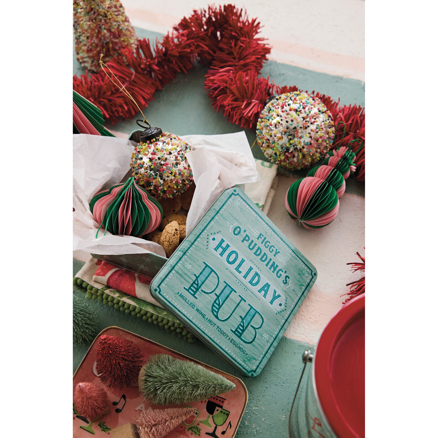 Catalog Name: 8-1/4" Square x 3-1/4"H, 7" Square x 3"H & 6" Square x 2-3/4"H Embossed Tins w/ Lids, Holiday Bar Saying & Image, Multi Color, Set of 3 ©
