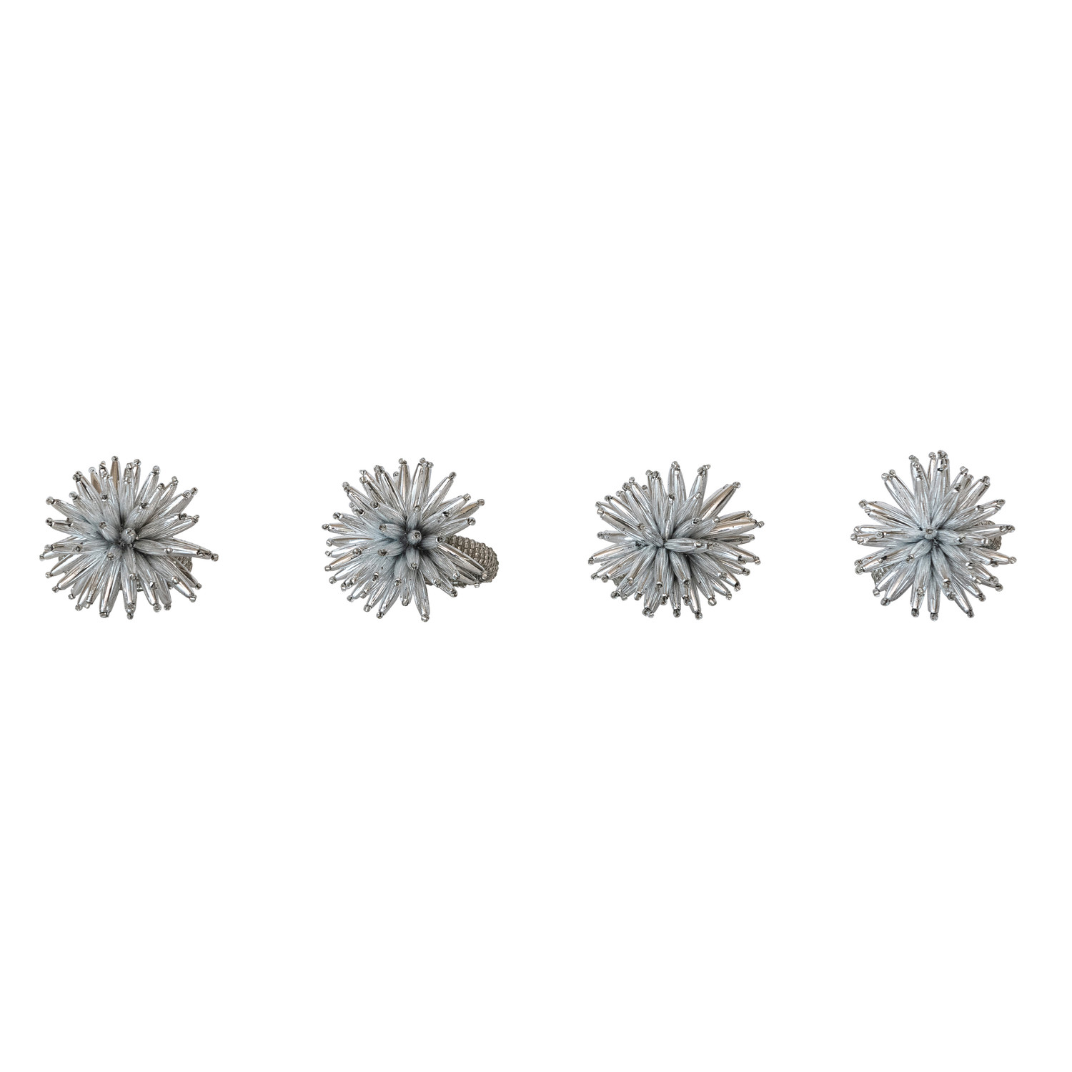 Catalog Name: 1-3/4" Round x 3"H Handmade Glass Beaded Metal Snowflake Napkin Rings, Silver Finish, Set of 4 Tied w/ Jute