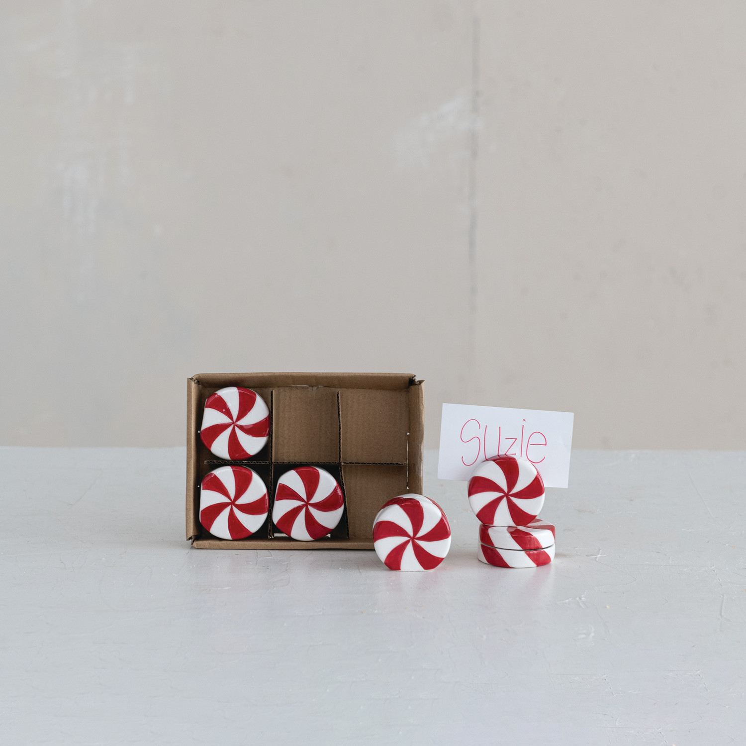 Catalog Name: 2" Round Stoneware Peppermint Candy Shaped Place Card/Photo Holders w/ 12 Paper Cards, Red & White, Boxed Set of 6