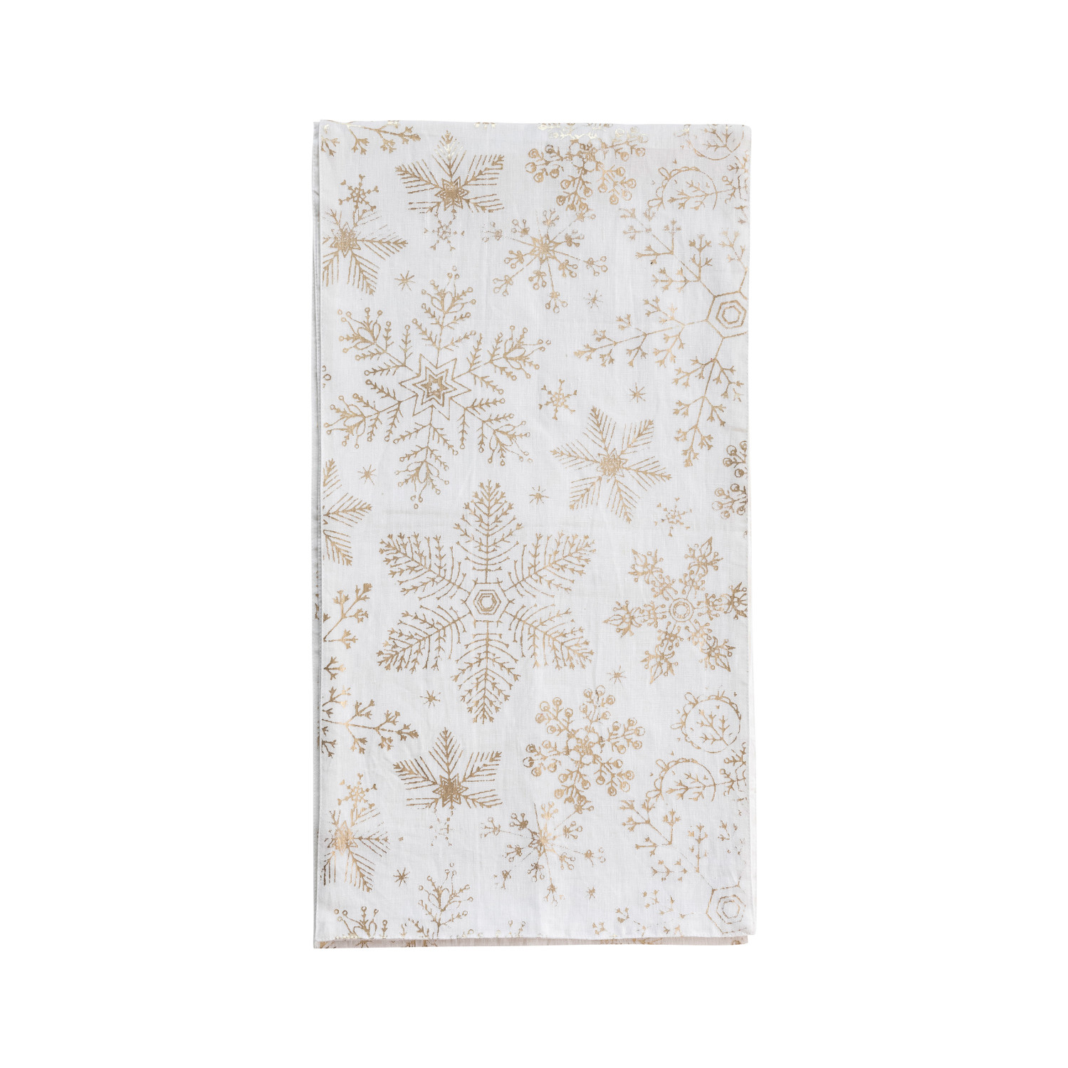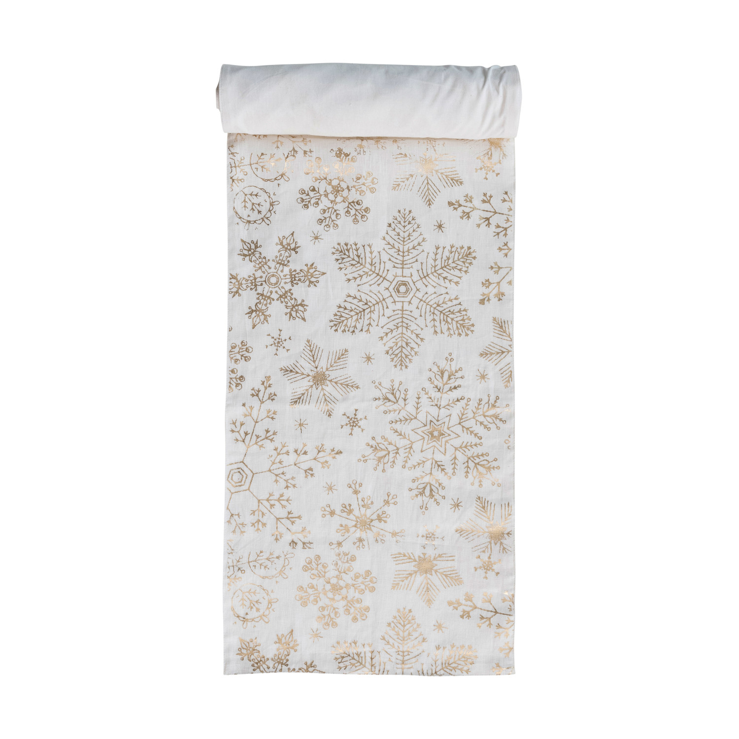 Linen & Cotton Printed Table Runner w/ Gold Foil Snowflake Pattern, White
