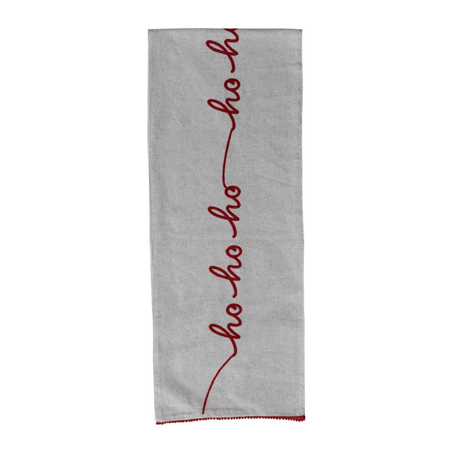 Table Runner with Pom Pom Trim & Embroidered "Ho Ho Ho", Natural & Red