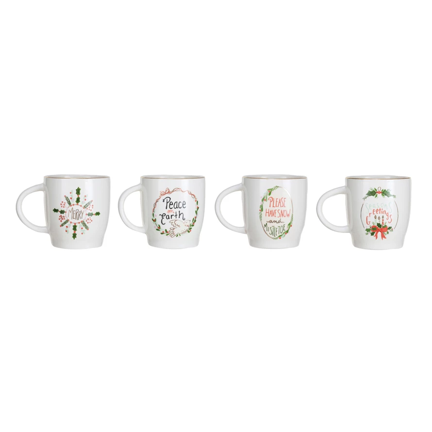 Catalog Name: 3-3/4" Round x 4"H 14 oz. Stoneware Mug w/ Holiday Saying & Gold Electroplated Rim, Multi Color, 4 Styles ©