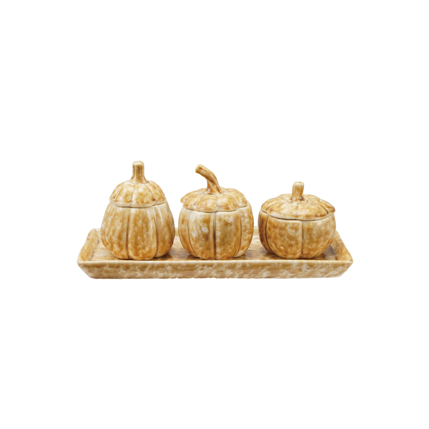 Stoneware Tray with 3 Pumpkin Shaped Jars, Brown, Set of 4 (Each One Will Vary)