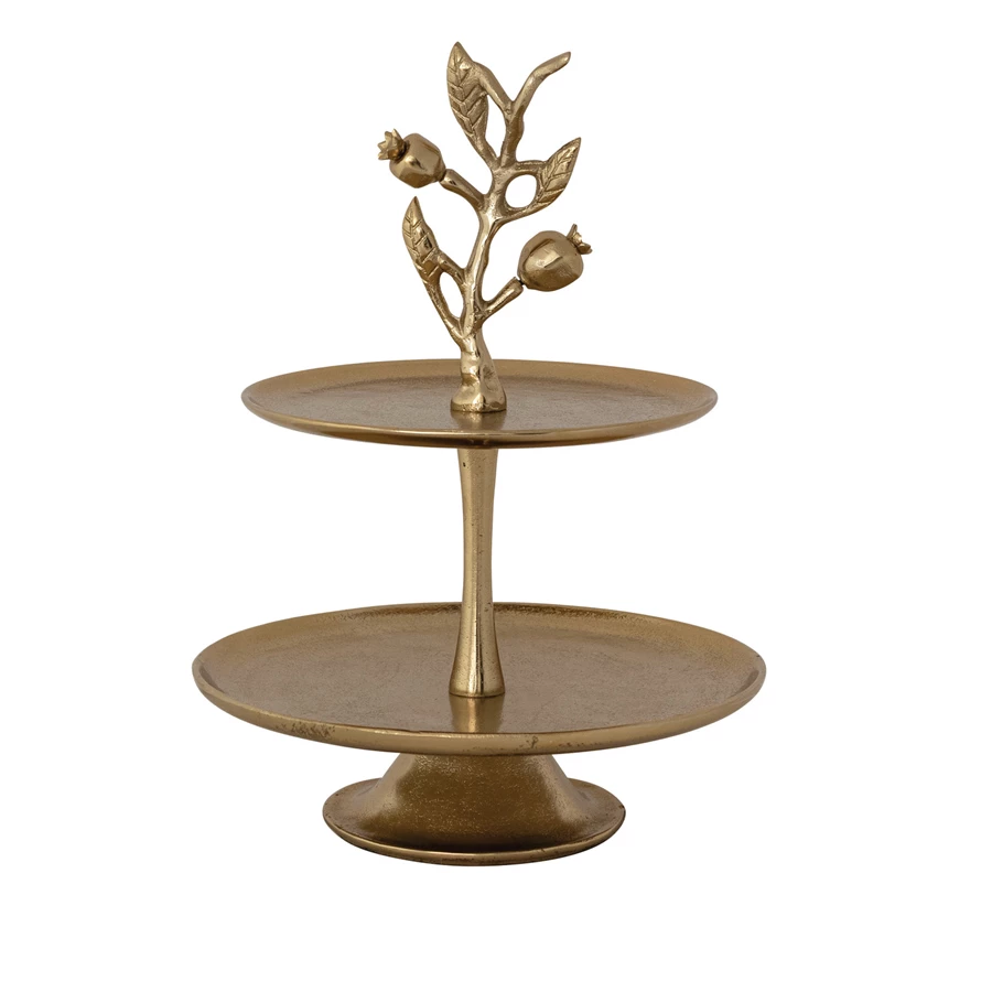 Cast Aluminum 2-Tier Tray with Pomegranate Branch Shaped Handle, Gold Finish, KD