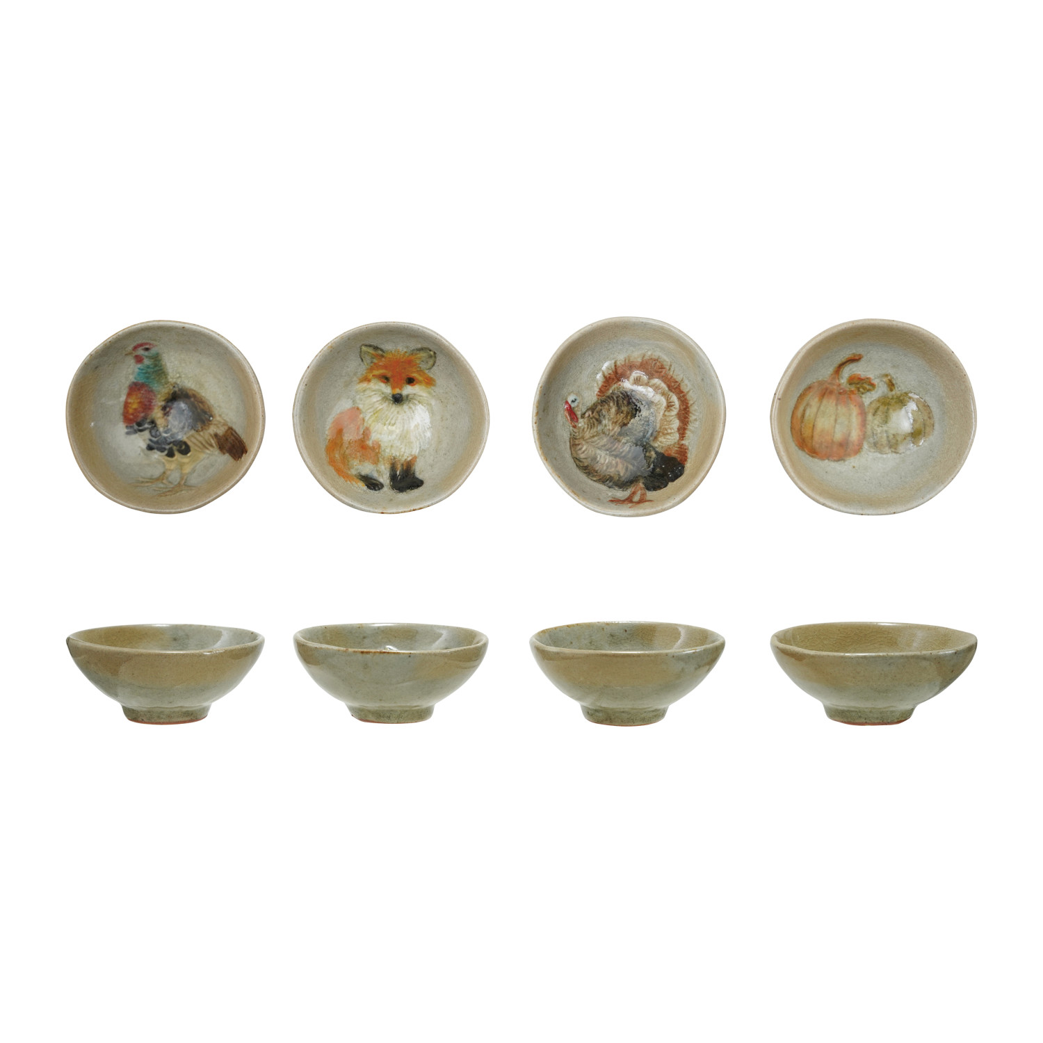 Catalog Name: 3-1/2" Round Hand-Painted Stoneware Dish w/ Animal/Pumpkins, Reactive Crackle Glaze, Multi Color, 4 Styles (Each One Will Vary)