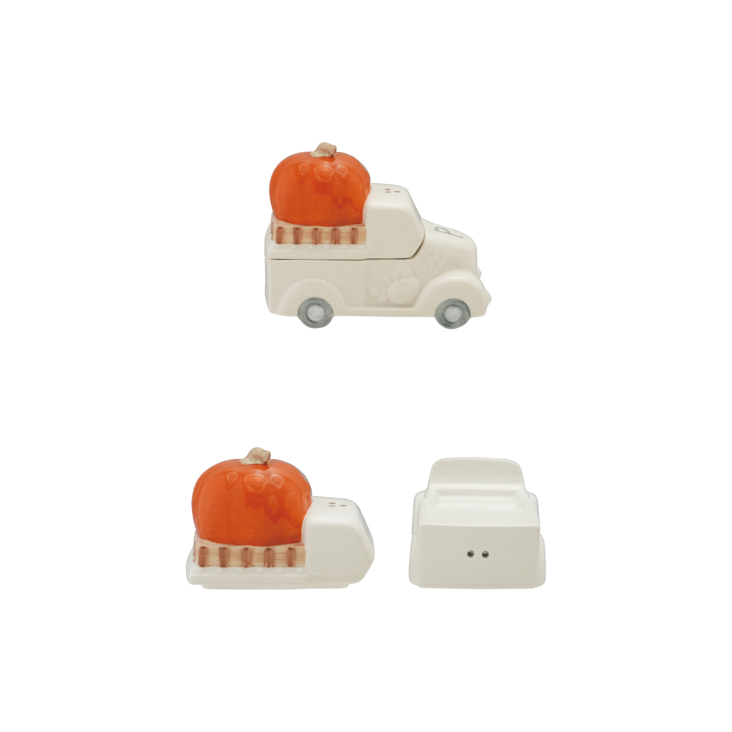 Catalog Name: 4"L x 2"W x 3"H Ceramic Pumpkin on Truck Shaped Salt & Pepper Shakers, White & Orange Color, Set of 2